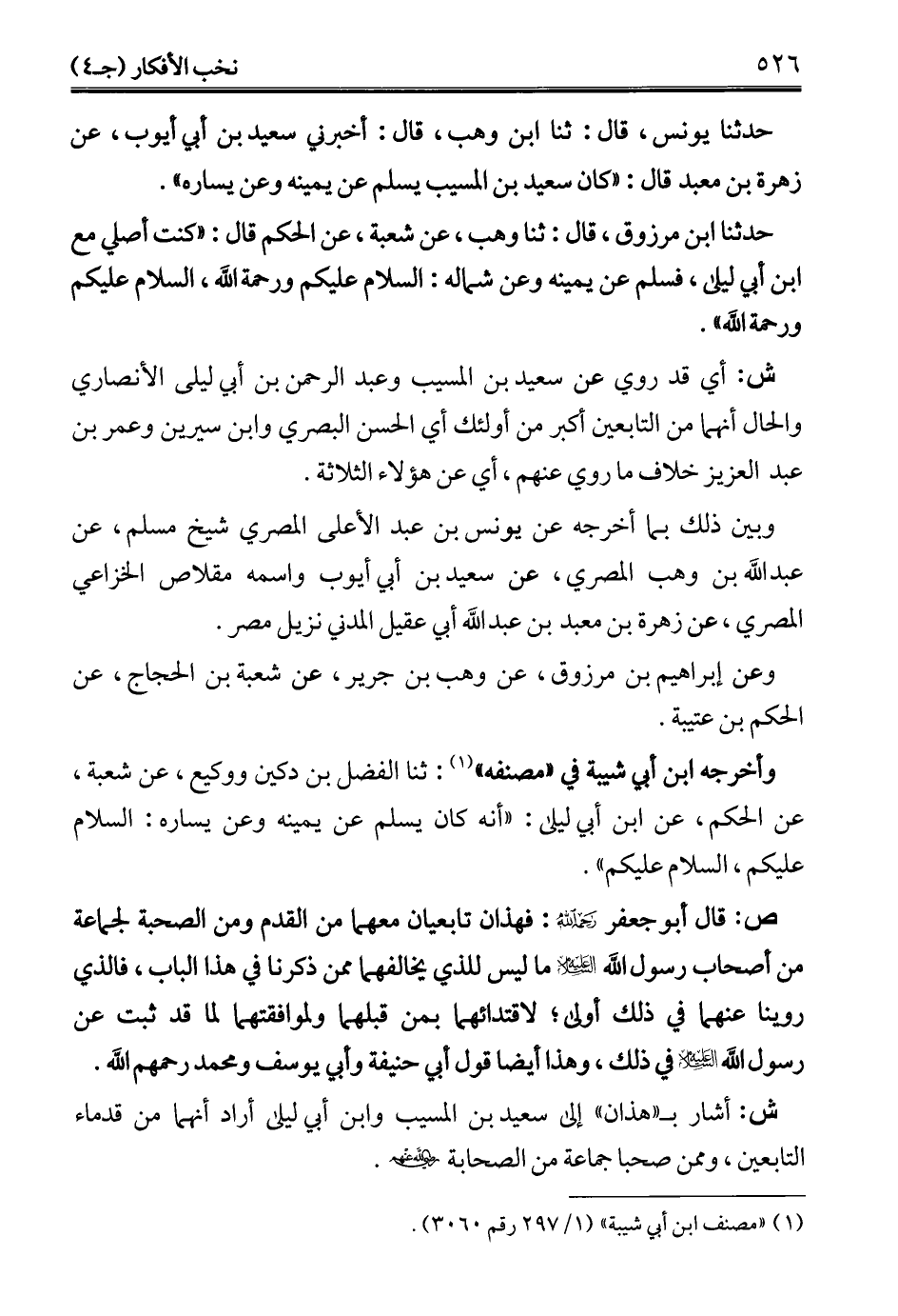 وأخرجه ابن أبي شيبة في "مصنفه" (¬1): ثنا الفضل بن دكين ووكيع، عن شعبة، عن الحكم، عن ابن أبي ليلى: "أنه كان يسلم عن يمينه وعن يساره: السلام عليكم، السلام عليكم".