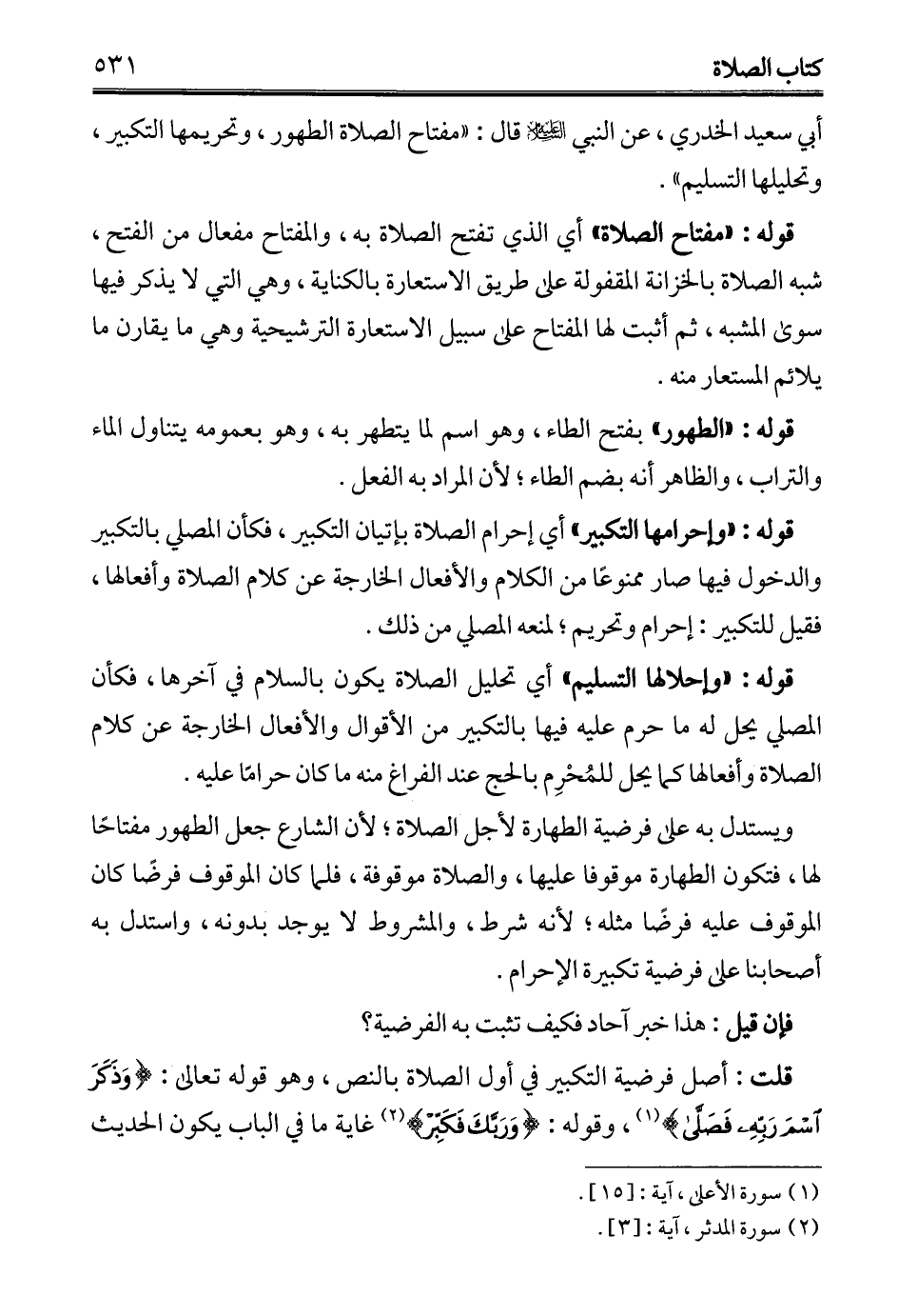 ويستدل به على فرضية الطهارة لأجل الصلاة؛ لأن الشارع جعل الطهور مفتاحًا لها، فتكون الطهارة موقوفًا عليها، والصلاة موقوفة، فلما كان الموقوف فرضًا كان الموقوف عليه فرضًا مثله؛ لأنه شرط، والمشروط لا يوجد بدونه، واستدل به أصحابنا على فرضية تكبيرة الإحرام.