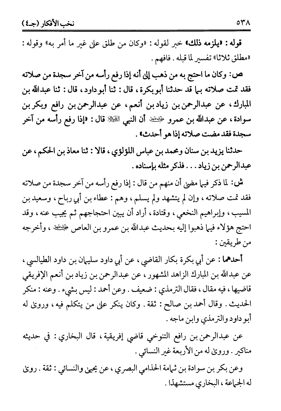 ص: وكان ما احتج به من ذهب إلى أنه إذا رفع رأسه من أخر سجدة من صلاته فقد تمت صلاته بما قد حدثنا أبو بكرة، قال: ثنا أبو داود، قال: ثنا عبد الله بن المبارك، عن عبد الرحمن بن زياد بن أنعم، عن عبد الرحمن بن رافع وبكر بن سوادة، عن عبد الله بن عمر - رضي الله عنهما - أن النبي - عليه السلام - قال: "إذا رفع رأسه من أخر سجدة فقد مضت صلاته إذا هو أحدث".