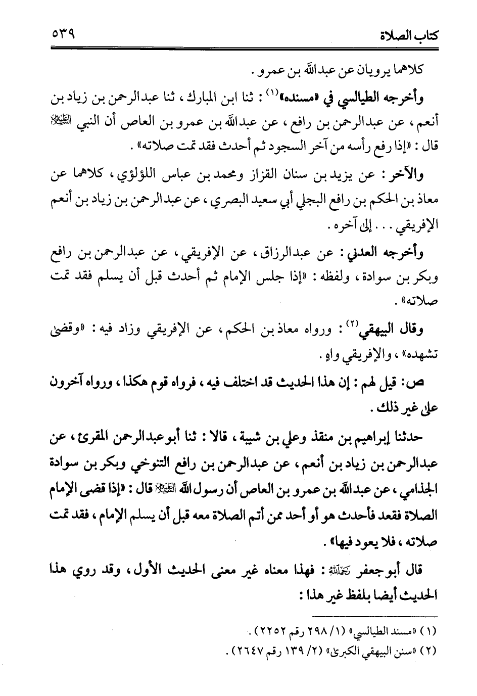 وأخرجه الطيالسي في "مسنده" (¬1): ثنا ابن المبارك، ثنا عبد الرحمن بن زياد بن أنعم، عن عبد الرحمن بن رافع، عن عبد الله بن عمرو بن العاص أن النبي - عليه السلام - قال: "إذا رفع رأسه من آخر السجود ثم أحدث فقد تمت صلاته".