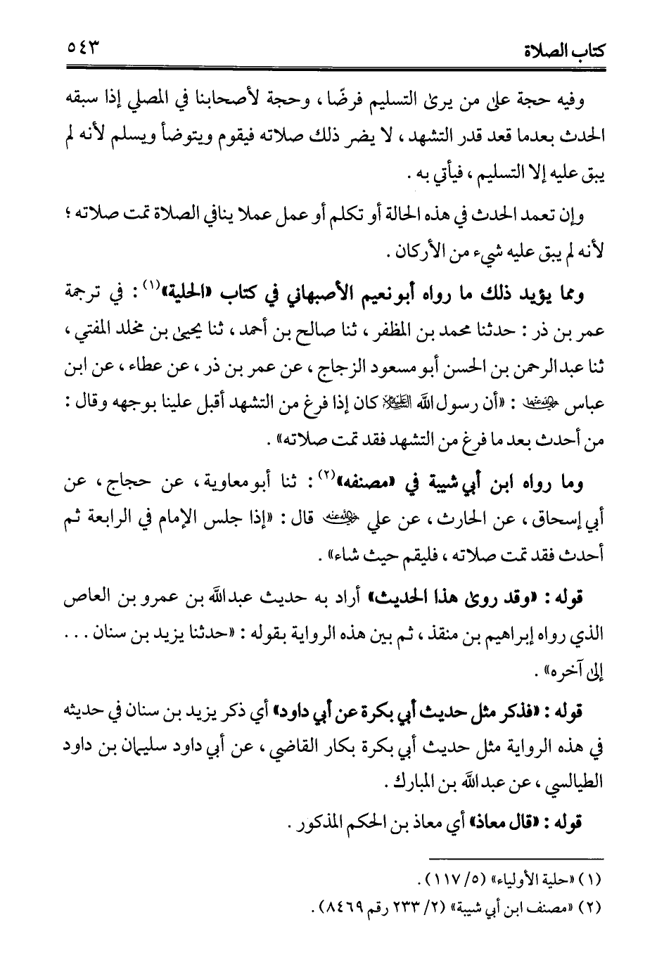 ومما يؤيد ذلك ما رواه أبو نعيم الأصبهاني في كتاب "الحلية" (¬1): في ترجمة عمر بن ذر: حدثنا محمَّد بن المظفر، ثنا صالح بن أحمد، ثنا يحيى بن مخلد المفتي، ثنا عبد الرحمن بن الحسن أبو مسعود الزجاج، عن عمر بن ذر، عن عطاء، عن ابن عباس - رضي الله عنهما -: "أن رسول الله - عليه السلام - كان إذا فرغ من التشهد أقبل علينا بوجهه وقال: من أحدث بعد ما فرغ من التشهد فقد تمت صلاته".
