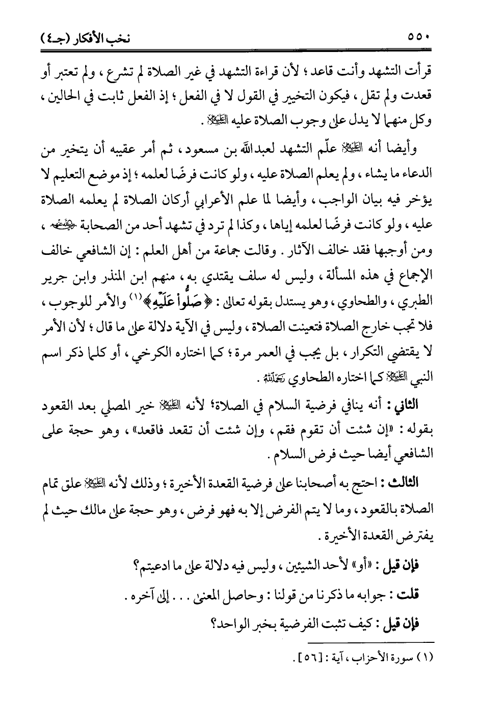 وأيضًا أنه - عليه السلام - علّم التشهد لعبد الله بن مسعود، ثم أمر عقيبه أن يتخير من الدعاء ما يشاء، ولم يعلم الصلاة عليه، ولو كانت فرضًا لعلمه؛ إذ موضع التعليم لا يؤخر فيه بيان الواجب، وأيضًا لما علم الأعرابي أركان الصلاة لم يعلمه الصلاة عليه، ولو كانت فرضًا لعلمه إياها، وكذا لم ترد في تشهد أحد من الصحابة - رضي الله عنهم -، ومن أوجبها فقد خالف الآثار. وقالت جماعة من أهل العلم: إن الشافعي خالف الإجماع في هذه المسألة، وليس له سلف يقتدي به، منهم ابن المنذر وابن جرير الطبري، والطحاوي، وهو يستدل بقوله تعالى: {صَلُّوا عَلَيْهِ} (¬1) والأمر للوجوب، فلا تجب خارج الصلاة فتعينت الصلاة، وليس في الآية دلالة على ما قال؛ لأن الأمر لا يقتضي التكرار، بل يجب في العمر مرة؛ كما اختاره الكرخي، أو كلما ذكر اسم النبي - عليه السلام - كما اختاره الطحاوي - رحمه الله -.