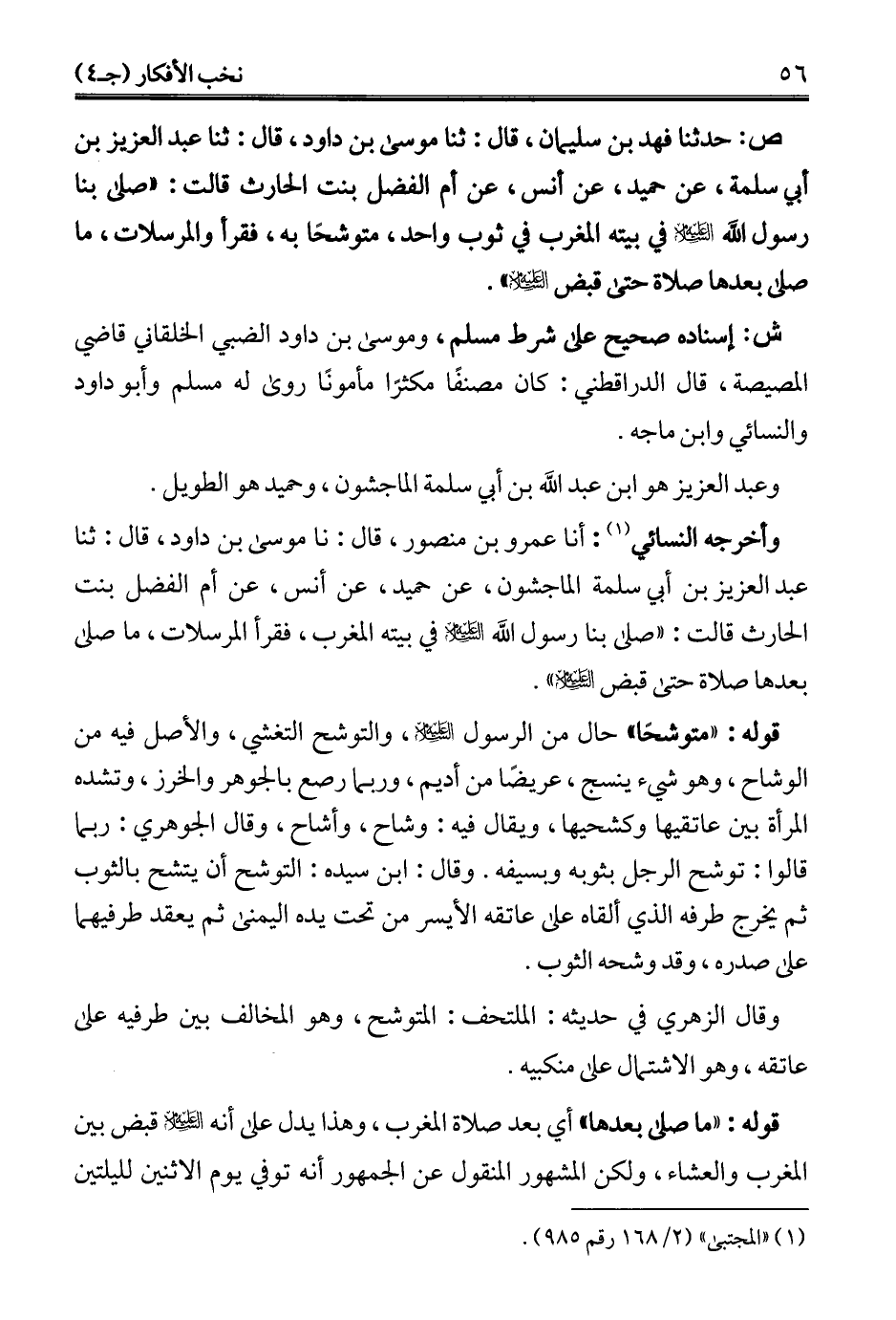 وأخرجه النسائي (¬1): أنا عمرو بن منصور، قال: نا موسى بن داود، قال: ثنا عبد العزيز بن أبي سلمة الماجشون، عن حميد، عن أنس، عن أم الفضل بنت الحارث قالت: "صلى بنا رسول الله - عليه السلام - في بيته المغرب، فقرأ المرسلات، ما صلى بعدها صلاة حتى قبض - عليه السلام -".