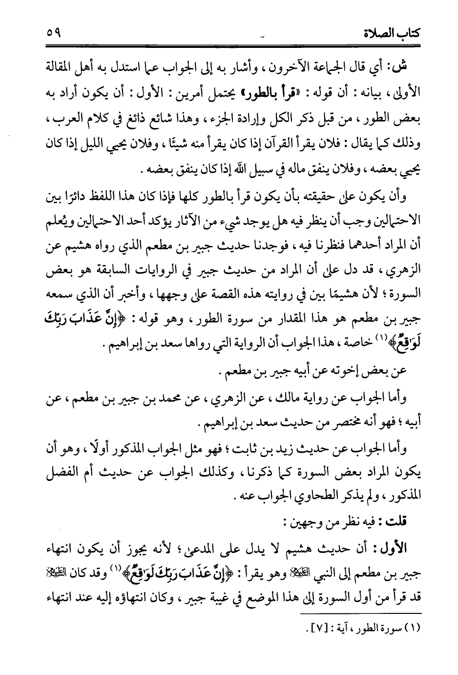 وأن يكون على حقيقته بأن يكون قرأ بالطور كلها فإذا كان هذا اللفظ دائرًا بين الاحتمالين وجب أن ينظر فيه هل يوجد شيء من الآثار يؤكد أحد الاحتمالين ويُعلم أن المراد أحدهما فنظرنا فيه، فوجدنا حديث جبير بن مطعم الذي رواه هشيم عن الزهري، قد دل على أن المراد من حديث جبير في الروايات السابقة هو بعض السورة؛ لأن هشيمًا بين في روايته هذه القصة على وجهها، وأخبر أن الذي سمعه جبير بن مطعم هو هذا المقدار من سورة الطور، وهو قوله: {إِنَّ عَذَابَ رَبِّكَ لَوَاقِعٌ} (¬1) خاصة، هذا الجواب أن الرواية التي رواها سعد بن إبراهيم.