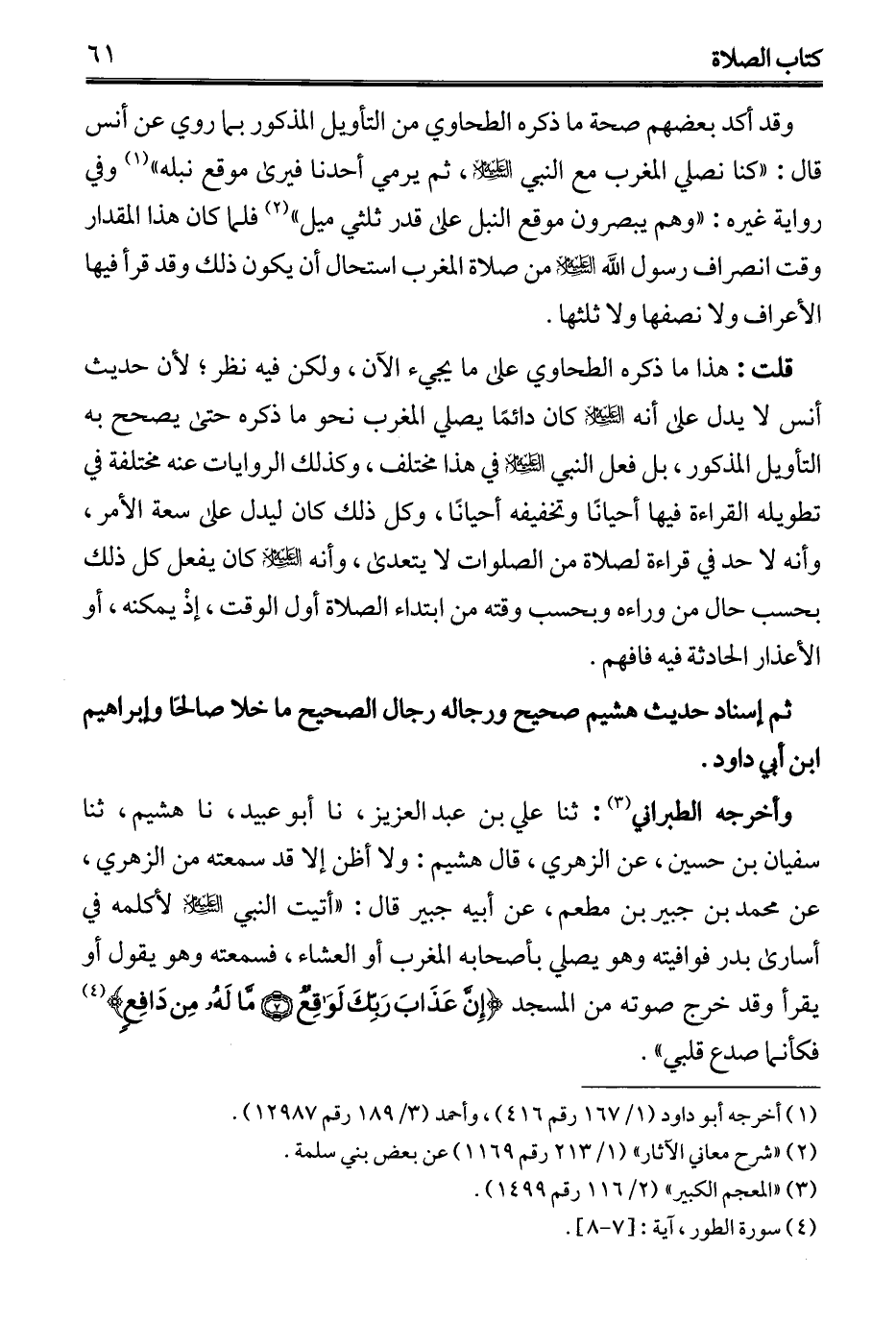 قلت: هذا ما ذكره الطحاوي على ما يجيء الآن، ولكن فيه نظرة لأن حديث أنس لا يدل على أنه - عليه السلام - كان دائمًا يصلي المغرب نحو ما ذكره حتى يصحح به التأويل المذكور، بل فعل النبي - عليه السلام - في هذا مختلف، وكذلك الروايات عنه مختلفة في تطويله القراءة فيها أحيانًا وتخفيفه أحيانًا، وكل ذلك كان ليدل على سعة الأمر، وأنه لا حد في قراءة لصلاة من الصلوات لا يتعدى، وأنه - عليه السلام - كان يفعل كل ذلك بحسب حال من وراءه وبحسب وقته من ابتداء الصلاة أول الوقت، إذْ يمكنه، أو الأعذار الحادثة فيه فافهم.