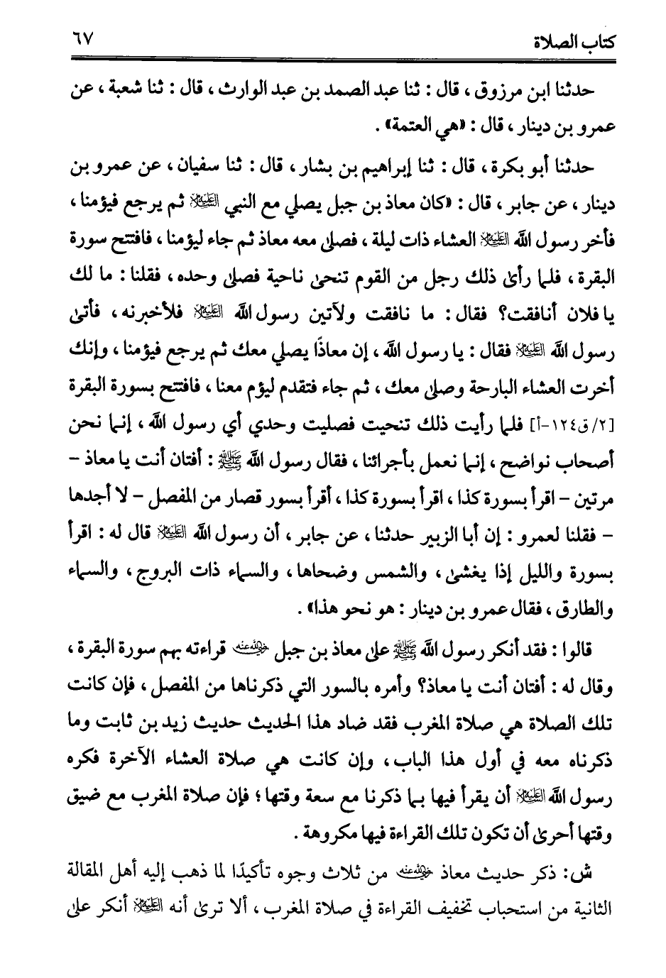 حدثنا أبو بكرة، قال: ثنا إبراهيم بن بشار، قال: ثنا سفيان، عن عمرو بن دينار، عن جابر، قال: "كان معاذ بن جبل يصلي مع النبي - عليه السلام - ثم يرجع فيؤمنا، فأخر رسول الله - عليه السلام - العشاء ذات ليلة، فصلى معه معاذ ثم جاء ليؤمنا، فافتتح سورة البقرة، فلما رأى ذلك رجل من القوم تنحى ناحية فصلى وحده، فقلنا: ما لك يا فلان أنافقت؟ فقال: ما نافقت ولآتين رسول الله - عليه السلام - فلأخبرنه، فأتى رسول الله - عليه السلام - فقال: يا رسول الله، إن معاذًا يصلي معك ثم يرجع فيؤمنا، وإنك أخرت العشاء البارحة وصك معك، ثم جاء فتقدم ليؤم معنا، فافتتح بسورة البقرة فلما رأيت ذلك تنحيت فصليت وحدي أي رسول الله، إنما نحن أصحاب نواضح، إنما نعمل بأجرائنا، فقال رسول الله - عليه السلام -: أفتان أنت يا معاذ -مرتين- اقرأ بسورة كذا، اقرأ بسورة كذا، أقرأ بسور قصار من المفصل -لا أجدها- فقلنا لعمرو: إن أبا الزبير حدثنا، عن جابر، أن رسول الله - عليه السلام - قال له: اقرأ بسورة والليل إذا يغشى، والشمس وضحاها، والسماء ذات البروج، والسماء والطارق، فقال عمرو بن دينار: هو نحو هذا".