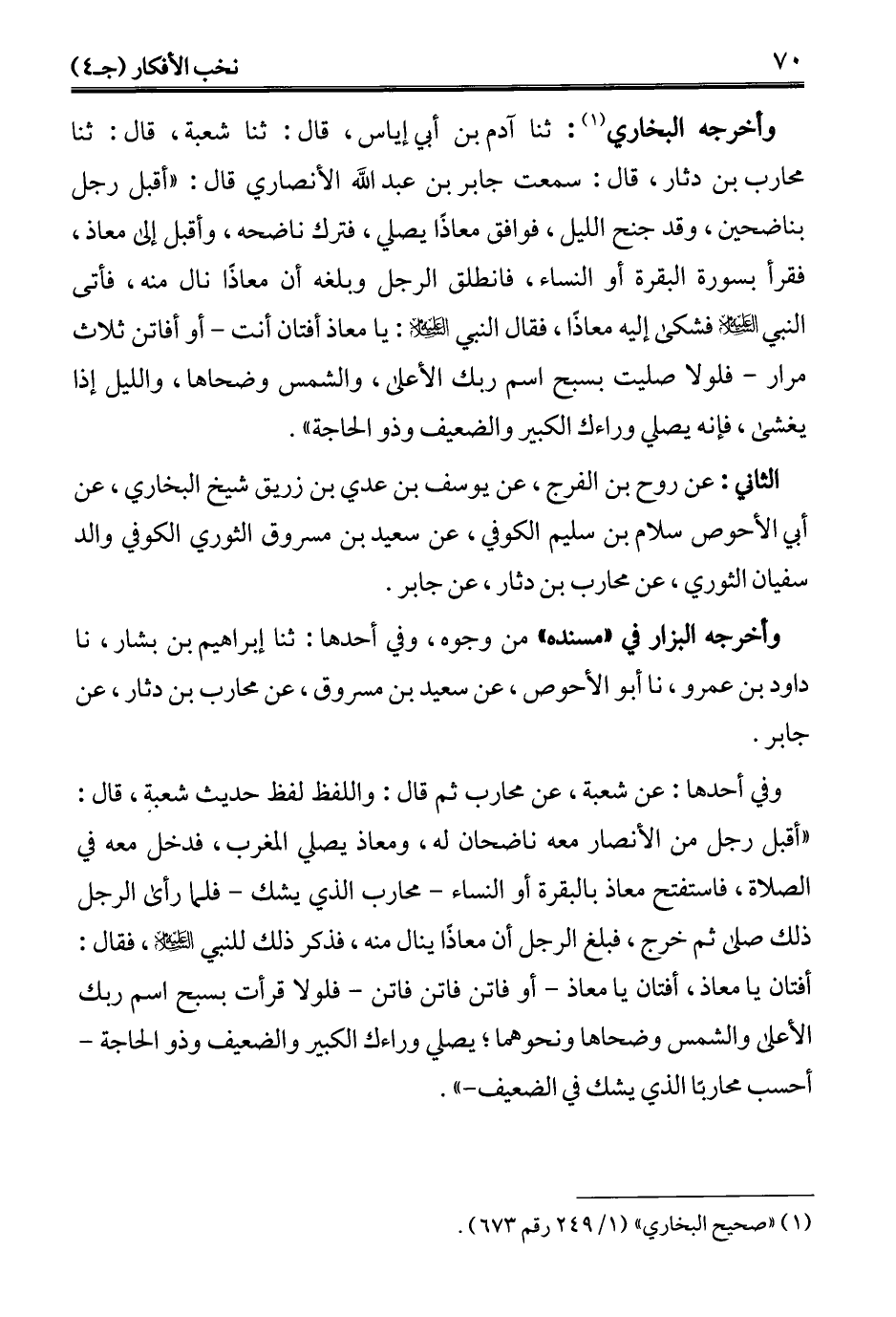 وفي أحدها: عن شعبة، عن محارب ثم قال: واللفظ لفظ حديث شعبة، قال: "أقبل رجل من الأنصار معه ناضحان له، ومعاذ يصلي المغرب، فدخل معه في الصلاة، فاستفتح معاذ بالبقرة أو النساء -محارب الذي يشك- فلما رأى الرجل ذلك صلى ثم خرج، فبلغ الرجل أن معاذًا ينال منه، فذكر ذلك للنبي - عليه السلام -، فقال: أفتان يا معاذ، أفتان يا معاذ -أو فاتن فاتن فاتن- فلولا قرأت بسبح اسم ربك الأعلى والشمس وضحاها ونحوهما؛ يصلي وراءك الكبير والضعيف وذو الحاجة -أحسب محاربًا الذي يشك في الضعيف-".