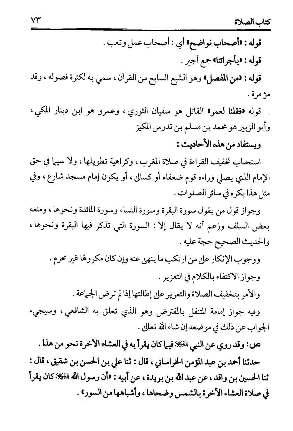 استحباب تخفيف القراءة في صلاة المغرب، وكراهية تطويلها, ولا سيما في حق الإِمام الذي يصلي وراءه قوم ضعفاء أو كسالى، أو يكون إمام مسجد شارع، وفي مثل هذا يكره في سائر الصلوات.
