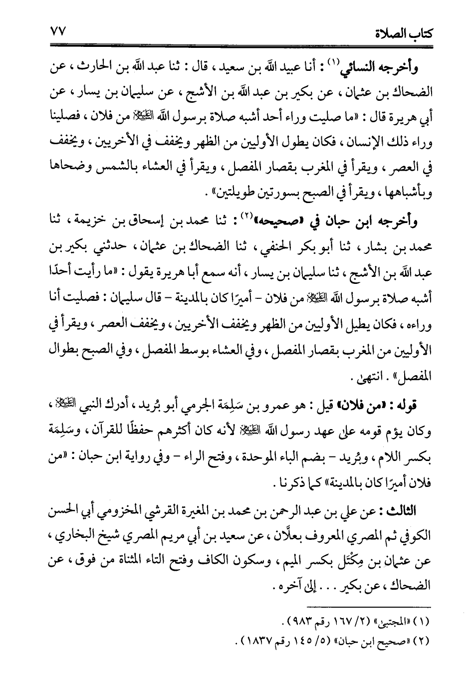 وأخرجه ابن حبان في "صحيحه" (¬2): ثنا محمد بن إسحاق بن خزيمة، ثنا محمد بن بشار، ثنا أبو بكر الحنفي، ثنا الضحاك بن عثمان، حدثني بكير بن عبد الله بن الأشج، ثنا سليمان بن يسار، أنه سمع أبا هريرة يقول: "ما رأيت أحدًا أشبه صلاة برسول الله - عليه السلام - من فلان -أميرًا كان بالمدينة- قال سليمان: فصليت أنا وراءه، فكان يطيل الأوليين من الظهر ويخفف الآخريين، ويخفف العصر، ويقرأ في الأوليين من المغرب بقصار المفصل، وفي العشاء بوسط المفصل، وفي الصبح بطوال المفصل" انتهى.