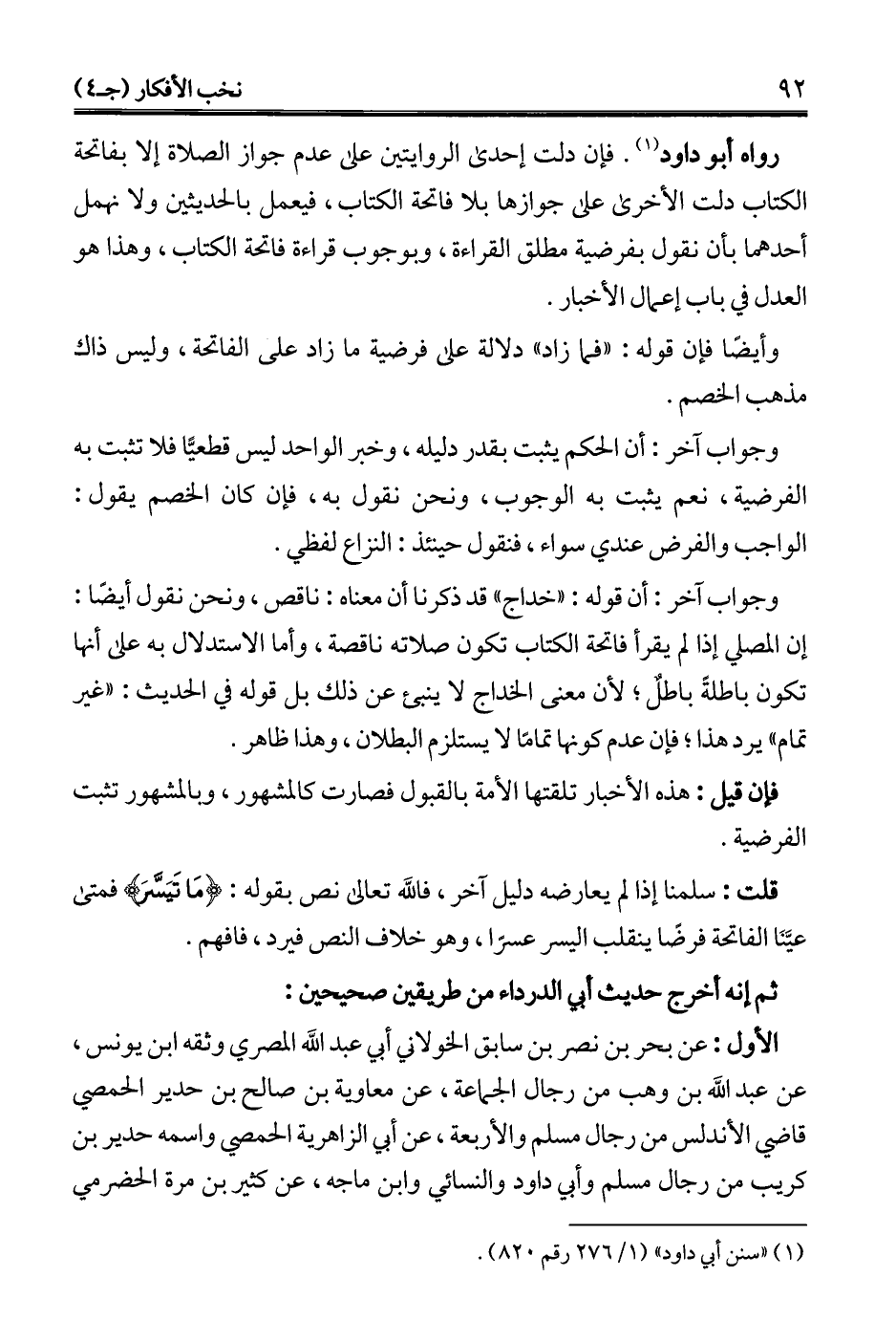 رواه أبو داود (¬1). فإن دلت إحدى الروايتين على عدم جواز الصلاة إلا بفاتحة الكتاب دلت الأخرى على جوازها بلا فاتحة الكتاب، فيعمل بالحديثين ولا نهمل أحدهما بأن نقول بفرضية مطلق القراءة، وبوجوب قراءة فاتحة الكتاب، وهذا هو العدل في باب إعمال الأخبار.