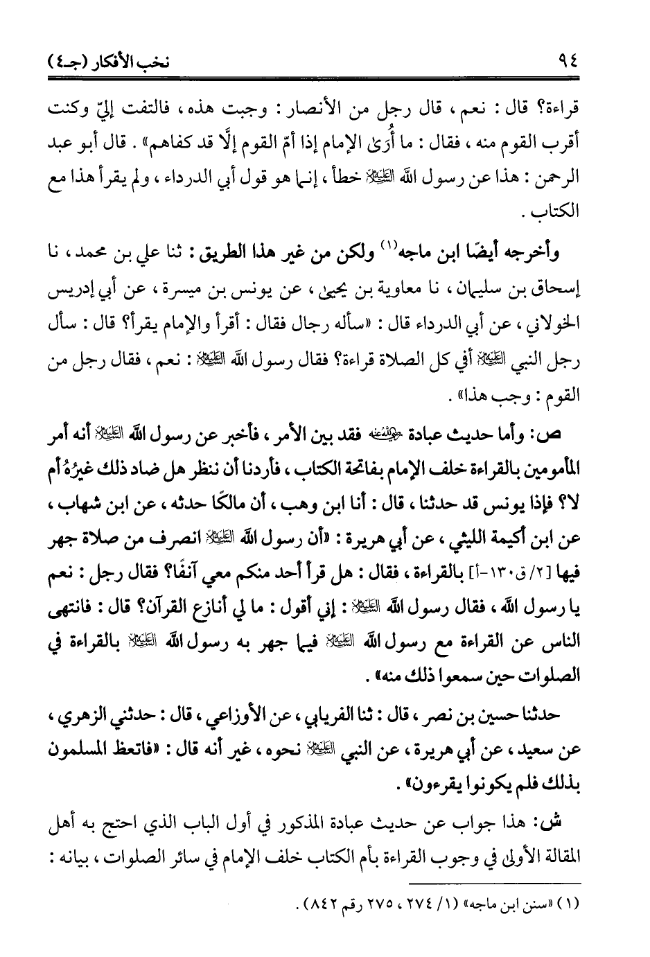 وأخرجه أيضًا ابن ماجه (¬1) ولكن من غير هذا الطريق: ثنا علي بن محمَّد، نا إسحاق بن سليمان، نا معاوية بن يحيى، عن يونس بن ميسرة، عن أبي إدريس الخولاني، عن أبي الدرداء قال: "سأله رجال فقال: أقرأ والإمام يقرأ؟ قال: سأل رجل النبي - عليه السلام - أفي كل الصلاة قراءة؟ فقال رسول الله - عليه السلام -: نعم، فقال رجل من القوم: وجب هذا".