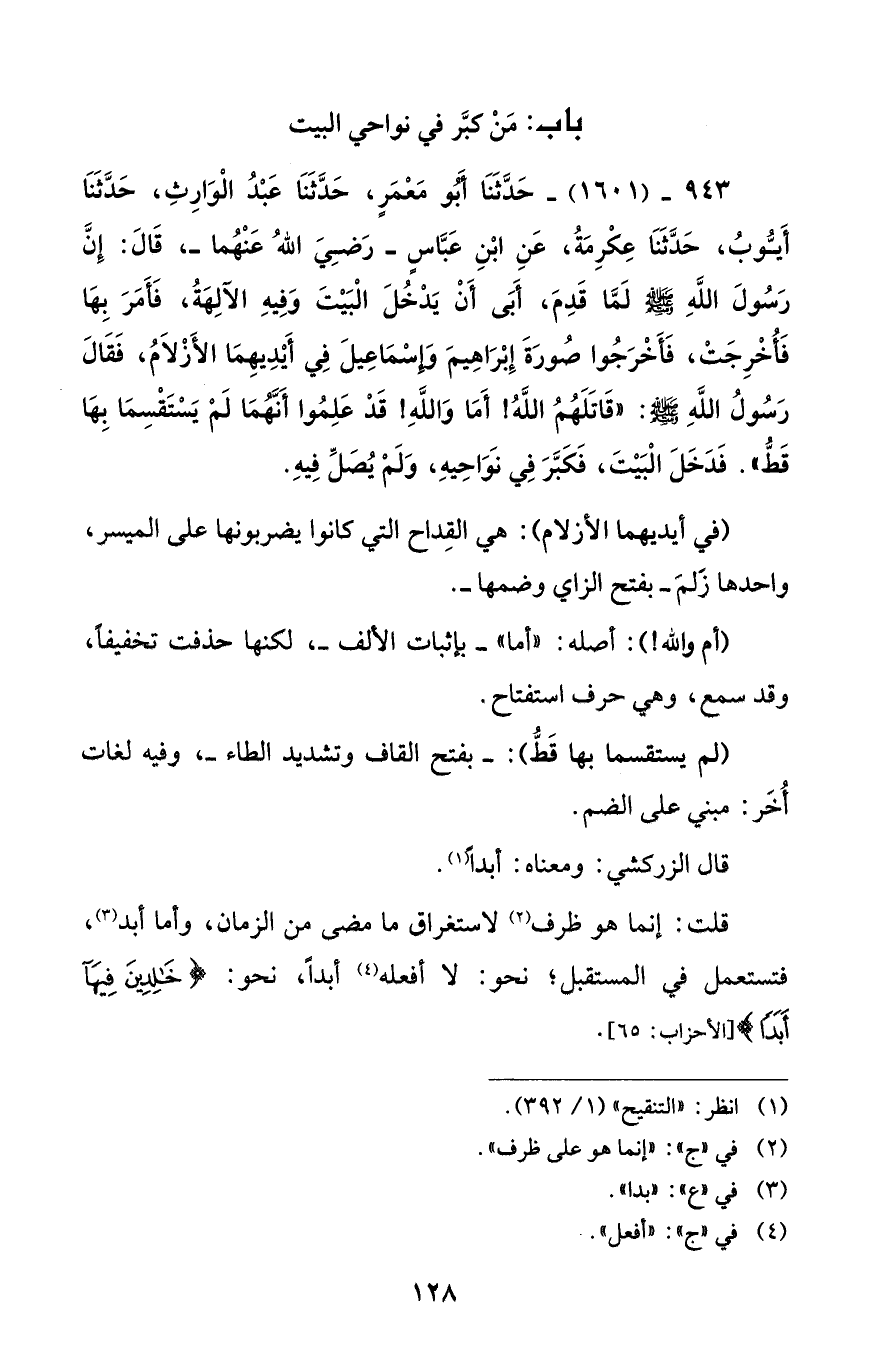 943 - (1601) - حَدَّثَنَا أَبُو مَعْمَرٍ، حَدَّثَنَا عَبْدُ الْوَارِثِ، حَدَّثَنَا أَيُّوبُ، حَدَّثَنَا عِكْرِمَةُ، عَنِ ابْنِ عَبَّاسٍ - رَضِيَ اللهُ عَنْهُما -، قَالَ: إِنَّ رَسُولَ اللَّهِ - صلى الله عليه وسلم - لَمَّا قَدِمَ، أَبَى أَنْ يَدْخُلَ الْبَيْتَ وَفِيهِ الآلِهَةُ، فَأَمَرَ بِهَا فَأُخْرِجَتْ، فَأَخْرَجُوا صُورَةَ إِبْرَاهِيمَ وَإسْمَاعِيلَ فِي أَيْدِيهِمَا الأَزْلاَمُ، فَقَالَ رَسُولُ اللَّهِ - صلى الله عليه وسلم -: "قَاتَلَهُمُ اللَّهُ! أَمَا وَاللَّهِ! قَدْ عَلِمُوا أَنَّهُمَا لَمْ يَسْتَقْسِمَا بِهَا قَطُّ". فَدَخَلَ الْبَيْتَ، فَكَبَّرَ فِي نَوَاحِيهِ، وَلَمْ يُصَلِّ فِيهِ.