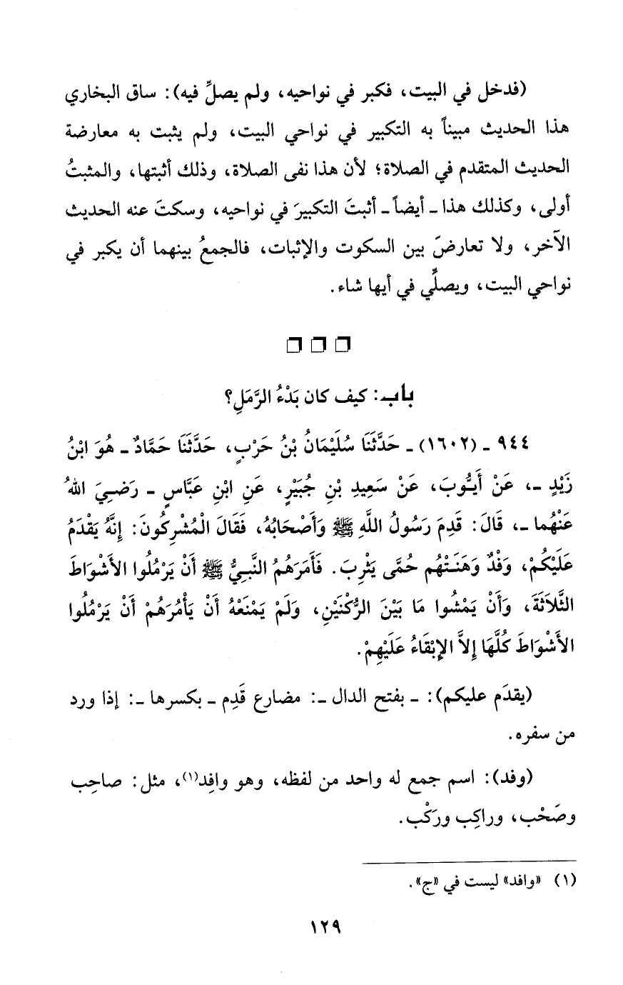 944 - (1602) - حَدَّثَنَا سُلَيْمَانُ بْنُ حَرْبٍ، حَدَّثَنَا حَمَّاد - هُوَ ابْنُ زيدٍ -، عَنْ أَيُّوبَ، عَنْ سَعِيدِ بْنِ جُبَيْرٍ، عَنِ ابْنِ عَبَّاسٍ - رَضِيَ اللهُ عَنْهُما -، قَالَ: قَدِمَ رَسُولُ اللَّهِ - صلى الله عليه وسلم - وَأَصْحَابُهُ، فَقَالَ الْمُشْرِكُونَ: إِنَّهُ يَقْدَمُ عَلَيْكُمْ، وَفْدٌ وَهَنَتْهُم حُمَّى يَثْرِبَ. فَأَمَرَهُمُ النَّبِيُّ - صلى الله عليه وسلم - أَنْ يَرْمُلُوا الأَشْوَاطَ الثَّلاَثَةَ، وَأَنْ يَمْشُوا مَا بَيْنَ الرُّكْنَيْنِ، وَلَمْ يَمْنَعْهُ أَنْ يَأْمُرَهُمْ أَنْ يَرْمُلُوا الأَشْوَاطَ كُلَّهَا إِلأَ الإبْقَاءُ عَلَيْهِمْ.