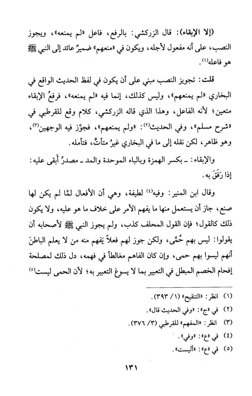 قلت: تجويز النصب مبني على أن يكون في لفظ الحديث الواقع في البخاري "لم يمنعهم"، وليس كذلك، إنما فيه "لم يمنعه"، فرفعُ الإبقاء متعين؛ لأنه الفاعل، وهذا الذي قاله الزركشي، كلام وقع للقرطبي في "شرح مسلم"، وفي الحديث (¬2): "ولم يمنعهم"، فجوَّز فيه الوجهين (¬3)، وهو ظاهر، لكن نقله إلى ما في البخاري غيرُ متأتٍّ، فتأمله.