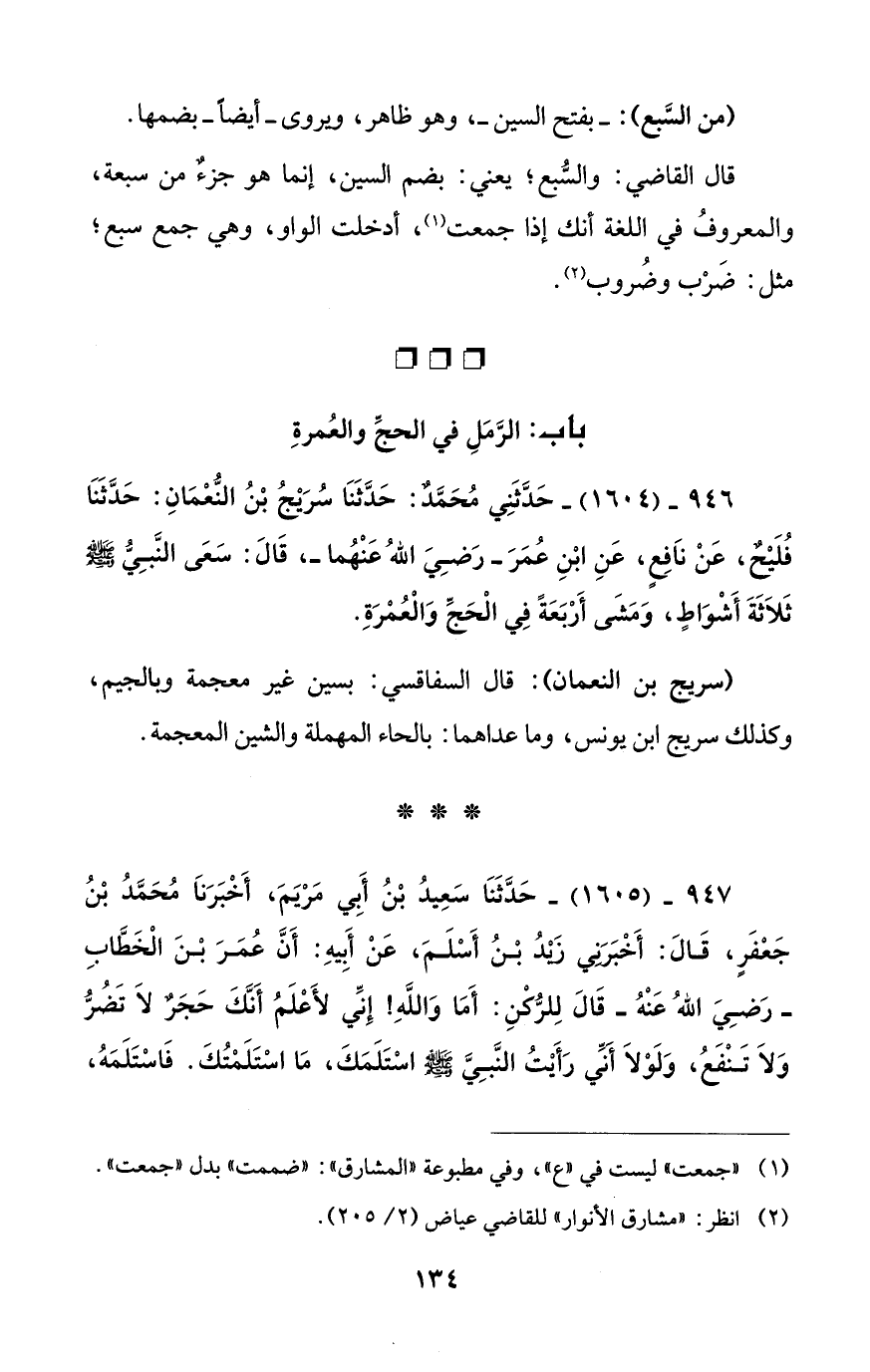 946 - (1604) - حَدَّثَنِي مُحَمَّدٌ: حَدَّثَنَا سُرَيْجُ بْنُ النُّعْمَانِ: حَدَّثَنَا فُلَيْحٌ، عَنْ نَافِعٍ، عَنِ ابْنِ عُمَرَ - رَضِيَ اللهُ عَنْهُما -، قَالَ: سَعَى النَّبِيُّ - صلى الله عليه وسلم - ثَلاَثَةَ أَشْوَاطٍ، وَمَشَى أَرْبَعَةً فِي الْحَجِّ وَالْعُمْرَةِ.