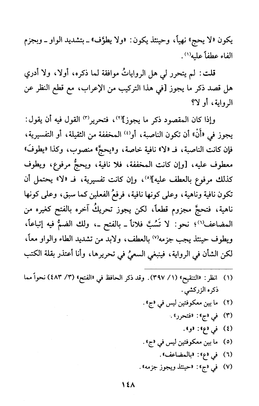وإذا كانت المقصود ذكر ما يجوز] (¬2)، فتحرير (¬3) القول فيه أن يقول: يجوز في "أَنْ" أن تكون الناصبة، أو (¬4) المخففة من الثقيلة، أو التفسيرية، فإن كانت الناصبة، فـ "لا" نافية خاصة، و"يحتجَّ" منصوب، وكذا "يطوفَ" معطوف عليه، [وإن كانت المخففة، فلا نافية، ويحجَّ" مرفوع، ويطوف كذلك مرفوع بالعطف عليه] (¬5)، وإن كانت تفسيرية، فـ "لا" يحتمل أن تكون نافية وناهية، وعلى كونها نافية، فرفعُ الفعلين كما سبق، وعلى كونها ناهية، فتحجَّ مجزوم قطعاً، لكن يجوز تحريكُ آخره بالفتح كغيره من المضاعف (¬6)؛ نحو: لا تَسُبَّ فلاناً - بالفتح -، ولك الضمُّ فيه إتباعاً، ويطوف حينئذ يجب جزمه (¬7) بالعطف، ولابد من تشديد الطاء والواو معاً، لكن الشأن في الرواية، فينبغي السعيُ في تحريرها، وأنا أعتذر بقلة الكتب