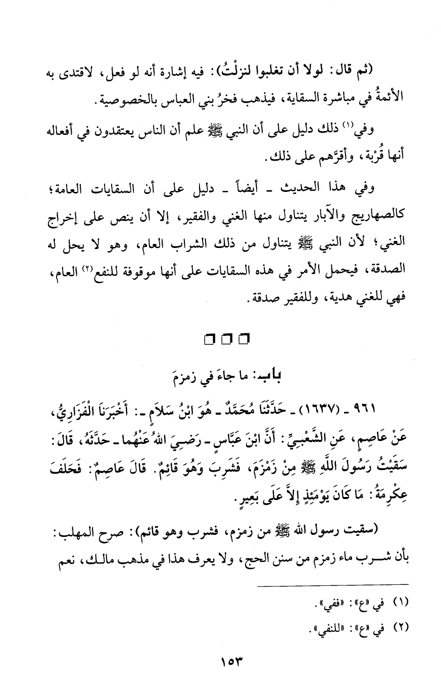 961 - (1637) - حَدَّثَنَا مُحَمَّدٌ - هُوَ ابْنُ سَلاَمٍ -: أَخْبَرَنَا الْفَزَارِيُّ، عَنْ عَاصِمٍ، عَنِ الشَّعْبِيِّ: أَنَّ ابْنَ عَبَّاسٍ - رَضِيَ اللهُ عَنْهُما - حَدَّثَهُ، قَالَ: سَقَيْتُ رَسُولَ اللَّهِ - صلى الله عليه وسلم - مِنْ زَمْزَمَ، فَشَرِبَ وَهُوَ قَائِمٌ. قَالَ عَاصِمٌ: فَحَلَفَ عِكْرِمَةُ: مَا كَانَ يَوْمَئِذٍ إِلاَّ عَلَى بَعِيرٍ.