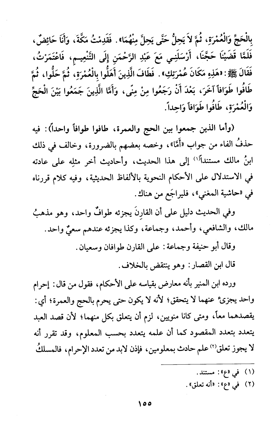 ورده ابن المنير بأنه معارض بقياسه على الأحكام، فقول من قال: إحرام واحد يجزئ عنهما لا يتحقق, لأنه لا يكون حتى يحرم بالحج والعمرة؛ أي: يقصدهما معاً، ومتى كانا منويين، لزم أن يتعلق بكل منهما؛ لأن قصد العبد يتعدد بتعدد المقصود كما أن علمه يتعدد بحسب المعلوم، وقد تقرر أنه لا يجوز تعلق (¬2) علم حادث بمعلومين، فإذن لابد من تعدد الإحرام، فالمسلكُ
