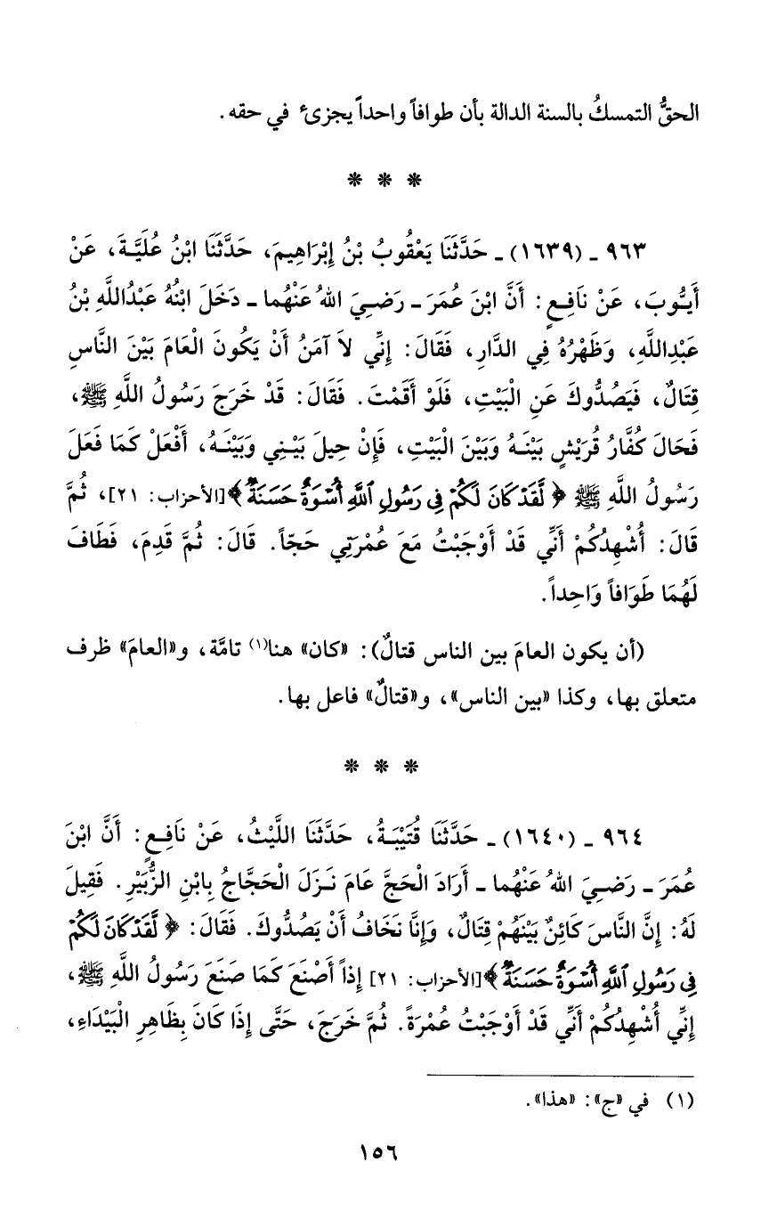 963 - (1639) - حَدَّثَنَا يَعْقُوبُ بْنُ إِبْرَاهِيمَ، حَدَّثَنَا ابْنُ عُلَيَّةَ، عَنْ أَيُّوبَ، عَنْ نَافِعٍ: أَنَّ ابْنَ عُمَرَ - رَضِيَ اللهُ عَنْهُما - دَخَلَ ابْنُهُ عَبْدُ اللَّهِ بْنُ عَبْدِ اللَّهِ، وَظَهْرُهُ فِي الدَّارِ، فَقَالَ: إِنِّي لَا آمَنُ أَنْ يَكُونَ الْعَامَ بَيْنَ النَّاسِ قِتَالٌ، فَيَصُدُّوكَ عَنِ الْبَيْتِ، فَلَوْ أَقَمْتَ. فَقَالَ: قَدْ خَرَجَ رَسُولُ اللَّهِ - صلى الله عليه وسلم -، فَحَالَ كُفَّارُ قُرَيْشٍ بَيْنَهُ وَبَيْنَ الْبَيْتِ، فَإِنْ حِيلَ بَيْنِي وَبَيْنَهُ، أَفْعَلْ كمَا فَعَلَ رَسُولُ اللَّهِ - صلى الله عليه وسلم - {لَقَدْ كَانَ لَكُمْ فِي رَسُولِ اللَّهِ أُسْوَةٌ حَسَنَةٌ} [الأحزاب: 21]، ثُمَّ قَالَ: أُشْهِدُكُمْ أَنِّي قَدْ أَوْجَبْتُ مَعَ عُمْرَتِي حَجًّا. قَالَ: ثُمَّ قَدِمَ، فَطَافَ لَهُمَا طَوَافاً وَاحِداً.
