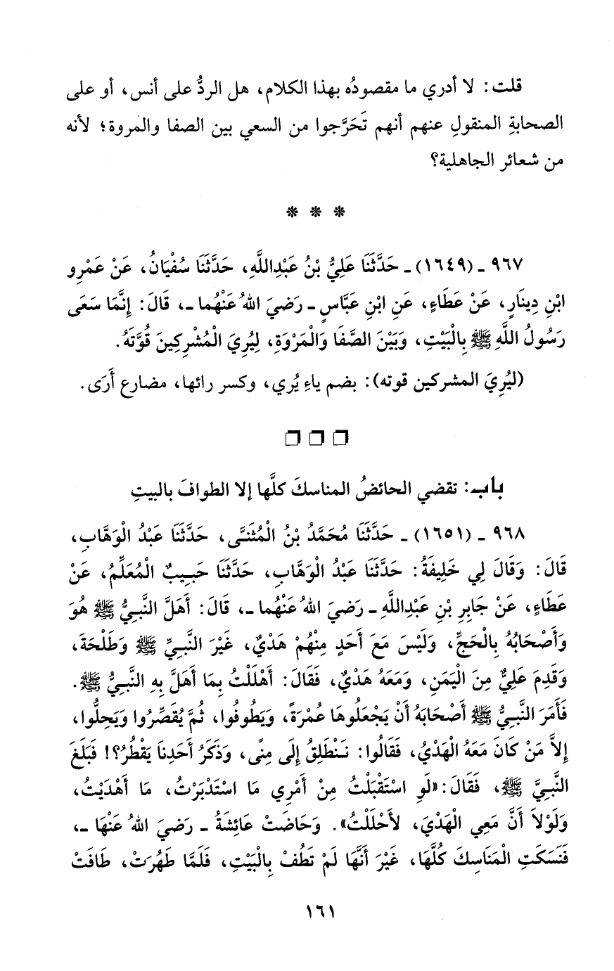 968 - (1651) - حَدَّثَنَا مُحَمَّدُ بْنُ الْمُثَنَّى، حَدَّثَنَا عَبْدُ الْوَهَّابِ، قَالَ: وَقَالَ لِي خَلِيفَةُ: حَدَّثَنَا عَبْدُ الْوَهَّابِ، حَدَّثَنَا حَبِيبٌ الْمُعَلِّمُ، عَنْ عَطَاءٍ، عَنْ جَابِرِ بْنِ عَبْدِ اللَّهِ -رَضيَ اللهُ عَنْهُما -، قَالَ: أَهَلَّ النَّبيُّ - صلى الله عليه وسلم - هُوَ وَأَصْحَابُهُ بِالْحَجِّ، وَلَيْسَ مَعَ أَحَدٍ مِنْهُمْ هَدْيٌ، غَيْرَ النَّبِيِّ - صلى الله عليه وسلم - وَطَلْحَةَ، وَقَدِمَ عَلِيٌّ مِنَ الْيَمَنِ، وَمَعَهُ هَدْيٌ، فَقَالَ: أَهْلَلْتُ بِمَا أَهَلَّ بِهِ النَّبِيُّ - صلى الله عليه وسلم -. فَأَمَرَ النَّبِيُّ - صلى الله عليه وسلم - أَصْحَابَهُ أَنْ يَجْعَلُوهَا عُمْرَةً، وَيَطُوفُوا، ثُمَّ يُقَصِّرُوا وَيَحِلُّوا، إِلاَّ مَنْ كَانَ مَعَهُ الْهَدْيُ، فَقَالُوا: نَنْطَلِقُ إِلَى مِنًى، وَذَكَرُ أَحَدِنَا يَقْطُرُ؟! فَبَلَغَ النَّبِيَّ - صلى الله عليه وسلم -، فَقَالَ: "لَوِ اسْتَقْبَلْتُ مِنْ أَمْرِي مَا اسْتَدْبَرْتُ، مَا أَهْدَيْتُ، وَلَوْلاَ أَنَّ مَعِي الْهَدْيَ، لأَحْلَلْتُ". وَحَاضَتْ عَائِشَةُ -رَضيَ اللهُ عَنْهَا-، فَنَسَكَتِ الْمَنَاسِكَ كُلَّهَا، غَيْرَ أَنَّهَا لَمْ تَطُفْ بِالْبَيْتِ، فَلَمَّا طَهُرَتْ، طَافَتْ