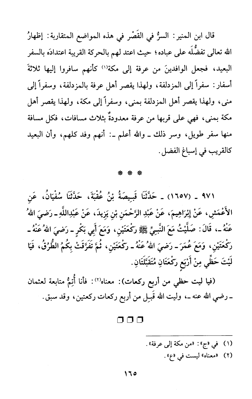 971 - (1657) - حَدَّثَنَا قَبِيصَةُ بْنُ عُقْبَةَ، حَدَّثَنَا سُفْيَانُ، عَنِ الأَعْمَشِ، عَنْ إِبْرَاهِيمَ، عَنْ عَبْدِ الرَّحْمَنِ بْنِ يَزِيدَ، عَنْ عَبْدِ اللَّهِ -رَضيَ اللهُ عَنْهُ -، قَالَ: صَلَّيْتُ مَعَ النَّبِيِّ - صلى الله عليه وسلم - ركْعَتَيْنِ، وَمَعَ أَبي بَكْرٍ -رَضيَ اللهُ عَنْهُ - رَكْعَتَيْنِ، وَمَعَ عُمَرَ -رَضيَ اللهُ عَنْهُ - رَكْعَتَيْنِ، ثُمَّ تَفَرَّقَتْ بِكُمُ الطّرُقُ، فَيَا لَيْتَ حَظِّي مِنْ أَرْبَعٍ رَكْعَتَانِ مُتَقَبَّلَتَانِ.