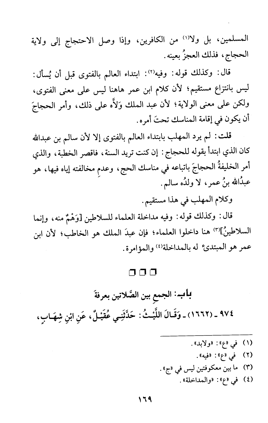 قلت: لم يرد المهلب بابتداء العالم بالفتوى إلا لأن سالم بن عبد الله كان الذي ابتدأ بقوله للحجاج: إن كنت تريد السنة، فاقصر الخطبة، والذي أمر الخليفةُ الحجاجَ باتباعه في مناسك الحج، وعدمِ مخالفته إياه فيها، هو عبدُ الله بنُ عمر، لا ولدُه سالم.