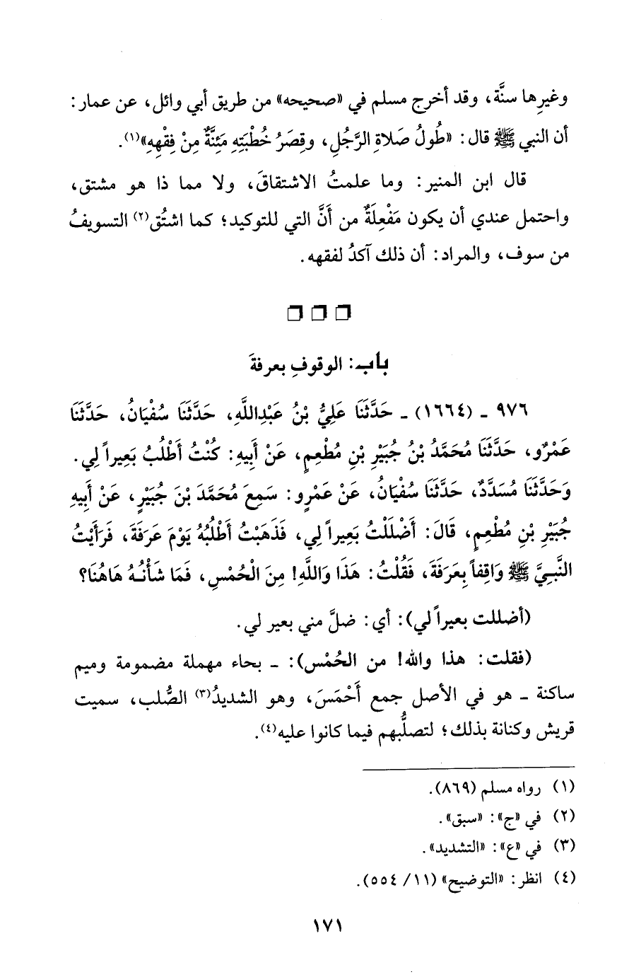 976 - (1664) - حَدَّثَنَا عَلِيُّ بْنُ عَبْدِ اللَّهِ، حَدَّثَنَا سُفْيَانُ، حَدَّثَنَا عَمْرٌو، حَدَّثَنَا مُحَمَّدُ بْنُ جُبَيْرِ بْنِ مُطْعِمٍ، عَنْ أَبيهِ: كُنْتُ أَطْلُبُ بَعِيراً لِي. وَحَدَّثَنَا مُسَدَّدٌ، حَدَّثَنَا سُفْيَانُ، عَنْ عَمْرٍو: سَمِعَ مُحَمَّدَ بْنَ جُبَيْرٍ، عَنْ أَبِيهِ جُبَيْرِ بْنِ مُطْعِمٍ، قَالَ: أَضْلَلْتُ بَعِيراً لِي، فَذَهَبْتُ أَطْلُبُهُ يَوْمَ عَرَفَةَ، فَرَأَيْتُ النَّبِيَّ - صلى الله عليه وسلم - وَاقِفاً بِعَرَفَةَ، فَقُلْتُ: هَذَا وَاللَّهِ! مِنَ الْحُمْسِ، فَمَا شَأْنُهُ هَاهُنَا؟