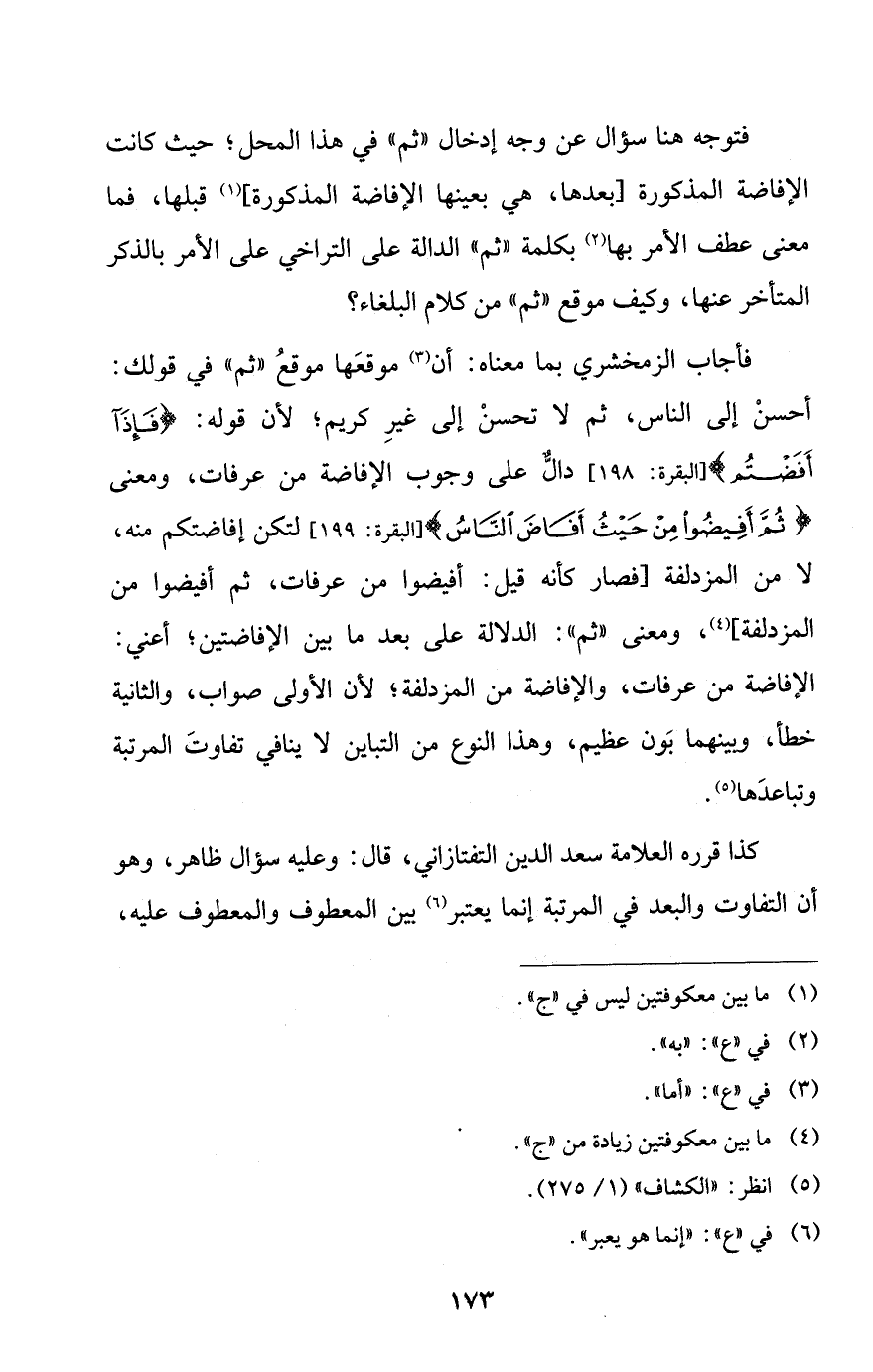 فأجاب الزمخشري بما معناه: أن (¬3) موقعَها موقعُ "ثم" في قولك: أحسنْ إلى الناس، ثم لا تحسنْ إلى غيرِ كريم؛ لأن قوله: {فَإِذَا أَفَضْتُمْ} [البقرة: 198] دالٌّ على وجوب الإفاضة من عرفات، ومعنى {ثُمَّ أَفِيضُوا مِنْ حَيْثُ أَفَاضَ النَّاسُ} [البقرة: 199] لتكن إفاضتكم منه، لا من المزدلفة [فصار كأنه قيل: أفيضوا من عرفات، ثم أفيضوا من المزدلفة] (¬4)، ومعنى "ثم": الدلالة على بعد ما بين الإفاضتين؛ أعني: الإفاضة من عرفات، والإفاضة من المزدلفة؛ لأن الأولى صواب، والثانية خطأ، وبينهما بَون عظيم، وهذا النوع من التباين لا ينافي تفاوتَ المرتبة وتباعدَها (¬5).