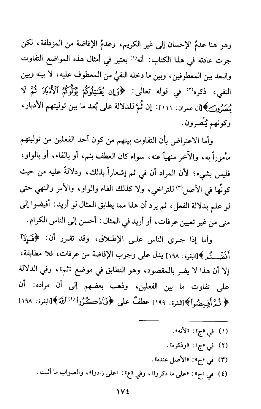 وهو هنا عدمُ الإحسان إلى غير الكريم، وعدمُ الإفاضة من المزدلفة، لكن جرت عادته في هذا الكتاب: أنه (¬1) يعتبر في أمثال هذه المواضع التفاوت والبعد بين المعطوفين، وبين ما دخله النفيُ من المعطوف عليه، لا بينه وبين النفي، ذكره (¬2) في قوله تعالى: {وَإِنْ يُقَاتِلُوكُمْ يُوَلُّوكُمُ الْأَدْبَارَ ثُمَّ لَا يُنْصَرُونَ} [آل عمران: 111]: إن ثُمَّ للدلالة على بُعد ما بين توليتهم الأدبار، وكونهم يُنْصرون.