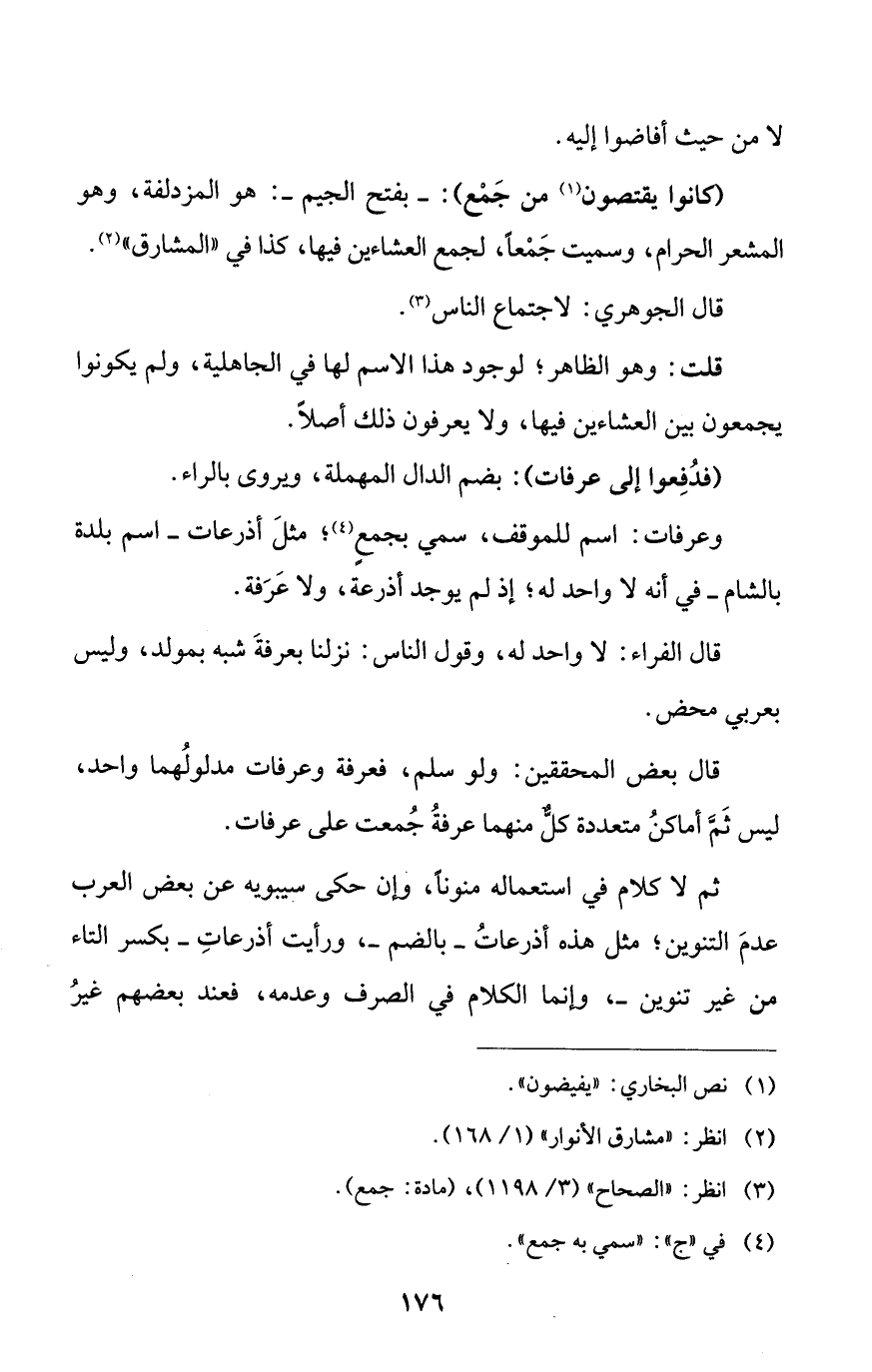 وعرفات: اسم للموقف، سمي بجمعٍ (¬4)؛ مثلَ أذرعات - اسم بلدة بالشام - في أنه لا واحد له؛ إذ لم يوجد أذرعة، ولا عَرَفة.