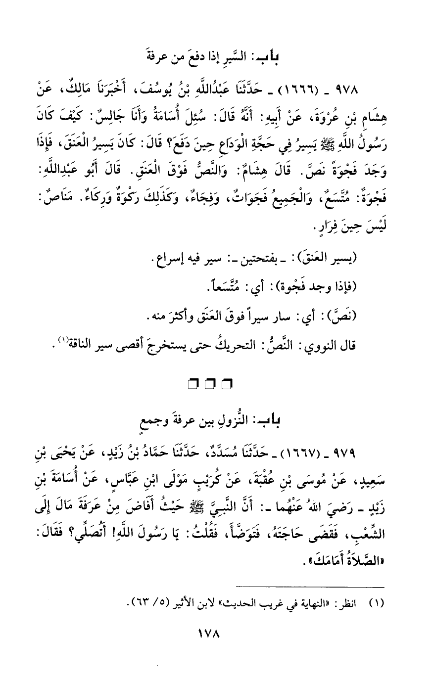 978 - (1666) - حَدَّثَنَا عَبْدُ اللَّهِ بْنُ يُوسُفَ، أَخْبَرَنَا مَالِكٌ، عَنْ هِشَامِ بْنِ عُرْوَةَ، عَنْ أَبِيهِ: أَنَّهُ قَالَ: سُئِلَ أُسَامَةُ وَأَنَا جَالِسٌ: كَيْفَ كَانَ رَسُولُ اللَّهِ - صلى الله عليه وسلم - يسِيرُ فِي حَجَّةِ الْوَدَاعِ حِينَ دَفَعَ؟ قَالَ: كَانَ يَسِيرُ الْعَنَقَ، فَإِذَا وَجَدَ فَجْوَةً نَصَّ. قَالَ هِشَامٌ: وَالنَّصُّ فَوْقَ الْعَنَقِ. قَالَ أَبُو عَبْدِ اللَّهِ: فَجْوَةٌ: مُتَّسَعٌ، وَالْجَمِيعُ فَجَوَاتٌ، وَفِجَاءٌ، وَكَذَلِكَ رَكوَةٌ وَرِكَاءٌ. مَنَاصٌ: لَيْسَ حِينَ فِرَارٍ.