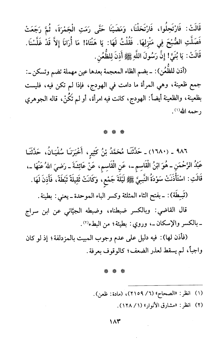 986 - (1680) - حَدَّثَنَا مُحَمَّدُ بْنُ كَثِيرٍ، أَخْبَرَنَا سُفْيَانُ، حَدَّثَنَا عَبْدُ الرَّحْمَنِ - هُوَ ابْنُ الْقَاسِم -، عَنِ الْقَاسِم، عَنْ عَائِشَةَ -رَضيَ اللهُ عَنْهَا -، قَالَتِ: اسْتَأْذَنت سَوْدَةُ النَّبِيَّ - صلى الله عليه وسلم - لَيْلَةَ جَمْعٍ، وَكَانت ثَقِيلَةً ثَبْطَةً، فَأَذِنَ لَهَا.