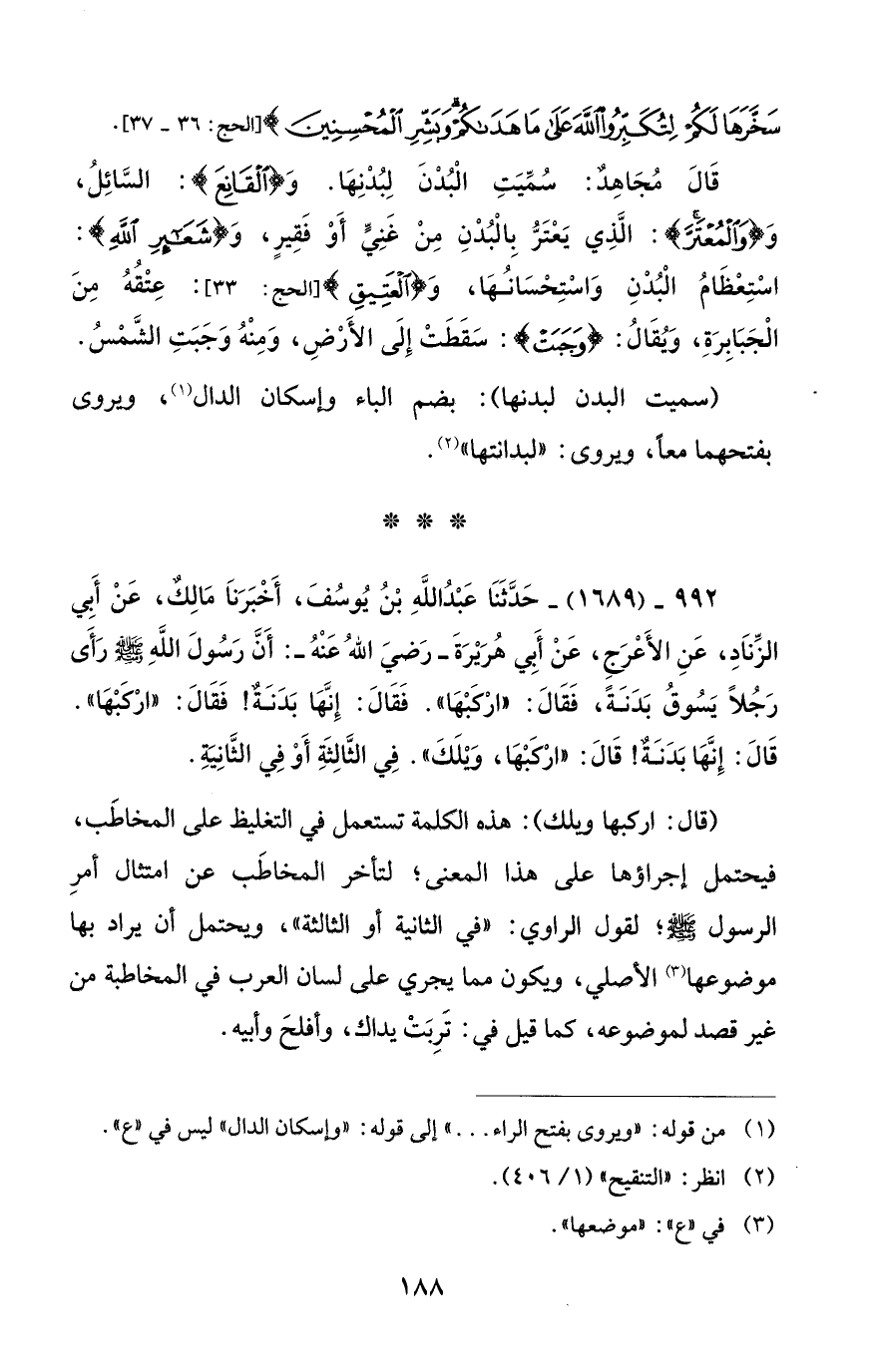 992 - (1689) - حَدَّثَنَا عَبْدُ اللَّهِ بْنُ يُوسُفَ، أَخْبَرَنَا مَالِكٌ، عَنْ أَبي الزِّنَادِ، عَنِ الأَعْرَجِ، عَنْ أَبِي هُرَيْرَةَ -رَضيَ اللهُ عَنْهُ -: أَنَّ رَسُولَ اللَّهِ - صلى الله عليه وسلم - رَأَى رَجُلاً يَسُوقُ بَدَنَةً، فَقَالَ: "ارْكَبْهَا". فَقَالَ: إِنَّهَا بَدَنَةٌ! فَقَالَ: "ارْكَبْهَا". قَالَ: إِنَّهَا بَدَنَةٌ! قَالَ: "ارْكبْهَا، ويْلَكَ". فِي الثَّالِثَةِ أَوْ فِي الثَّانِيَةِ.
