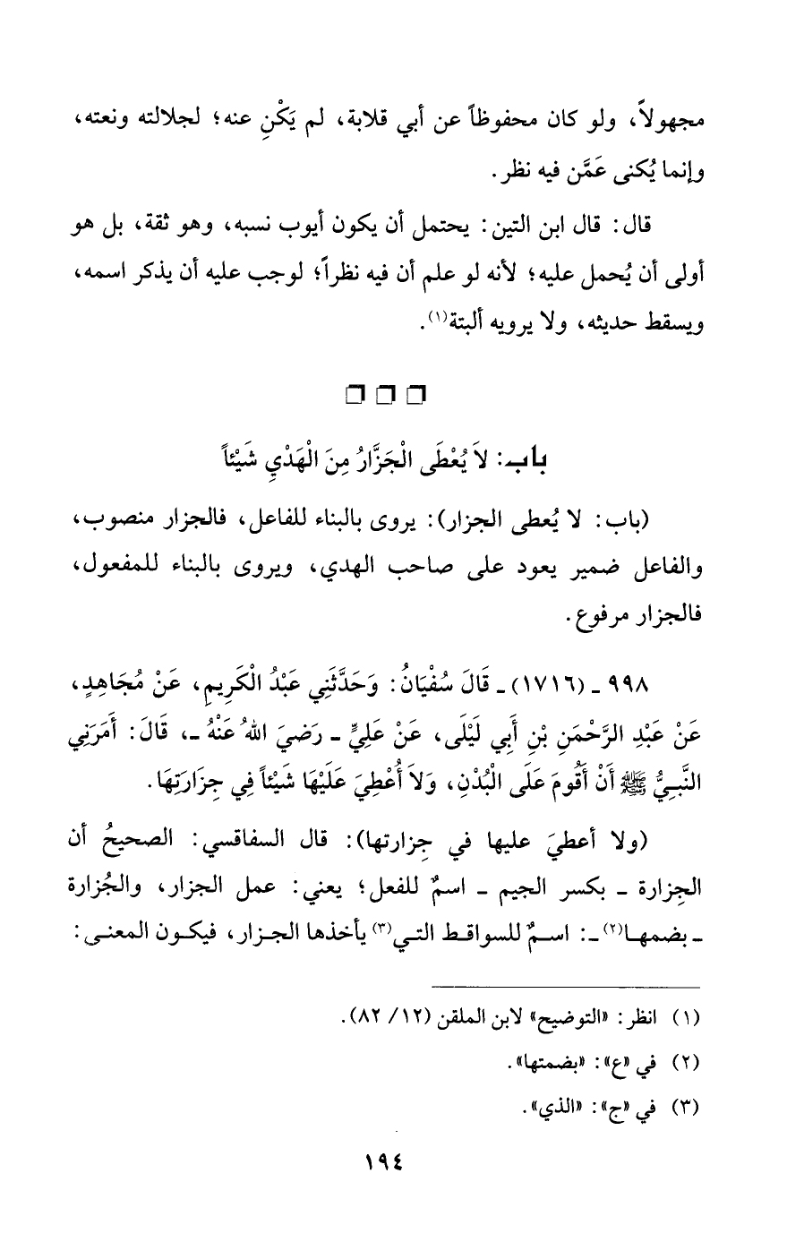 998 - (1716) - قَالَ سُفْيَانُ: وَحَدَّثَنِي عَبْدُ الْكَرِيم، عَنْ مُجَاهِدٍ، عَنْ عَبْدِ الرَّحْمَنِ بْنِ أَبِي لَيْلَى، عَنْ عَلِيٍّ -رَضيَ اللهُ عَنْهُ -، قَالَ: أَمَرَنِي النَّبِيُّ - صلى الله عليه وسلم - أَنْ أقومَ عَلَى الْبُدْنِ، وَلاَ أُعْطِيَ عَلَيْهَا شَيْئاً فِي جِزَارَتِهَا.