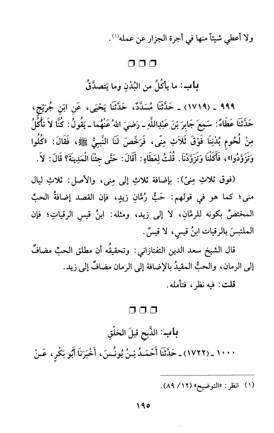 999 - (1719) - حَدَّثَنَا مُسَدَّدٌ، حَدَّثَنَا يَحْيَى، عَنِ ابْنِ جُرَيْجٍ، حَدَّثَنَا عَطَاءٌ: سَمِعِ جَابِرَ بْنَ عَبْدِ اللَّهِ -رَضيَ اللهُ عَنْهُما - يَقُولُ: كنَّا لَا نَأْكُلُ مِنْ لُحُومِ بُدْنِنَا فوْقَ ثَلاَثِ مِنًى، فَرَخَّصَ لَنَا النَّبِيُّ - صلى الله عليه وسلم -، فَقَالَ: "كُلُوا وَتَزَوَّدُوا"، فَأَكَلْنَا وَتَزَوَدْنَا. قُلْتُ لِعَطَاءٍ: أقالَ: حَتَّى جِئْنَا الْمَدِينَةَ؟ قَالَ: لَا.