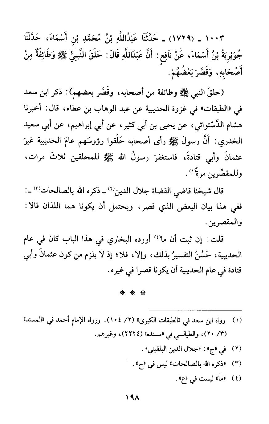 1003 - (1729) - حَدَّثَنَا عَبْدُ اللَّهِ بْنُ مُحَمَّدِ بْنِ أَسْمَاءَ، حَدَّثَنَا جُويرِيَةُ بْنُ أَسْمَاءَ، عَنْ نَافِعٍ: أَنَّ عَبْدَ اللَّهِ قَالَ: حَلَقَ النَّبِيُّ - صلى الله عليه وسلم - وَطَائِفَةٌ مِنْ أَصْحَابِهِ، وَقَصَّرَ بَعْضُهُمْ.