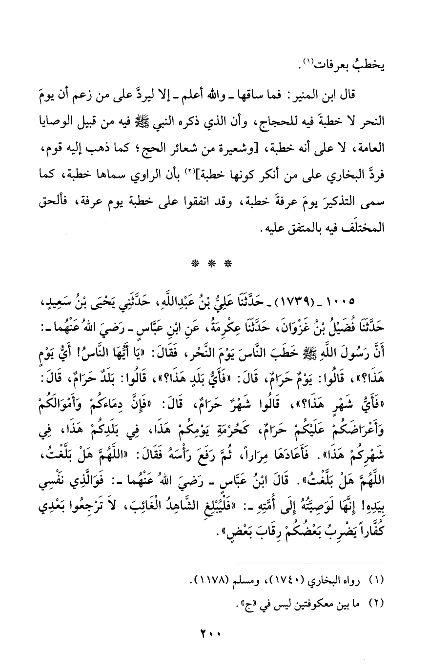 قال ابن المنير: فما ساقها - والله أعلم - إلا ليردَّ على من زعم أن يومَ النحر لا خطبةَ فيه للحجاج، وأن الذي ذكره النبي - صلى الله عليه وسلم - فيه من قبيل الوصايا العامة، لا على أنه خطبة، [وشعيرة من شعائر الحج؛ كما ذهب إليه قوم، فردَّ البخاري على من أنكر كونها خطبة] (¬2) بأن الراوي سماها خطبة، كما سمى التذكيرَ يومَ عرفةَ خطبة، وقد اتفقوا على خطبة يوم عرفة، فألحق المختلَف فيه بالمتفق عليه.
