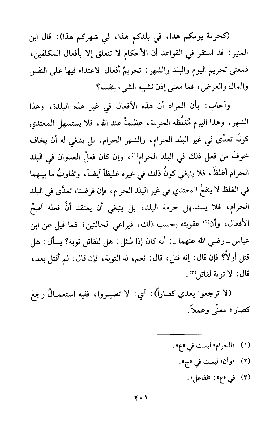 وأجاب: بأن المراد أن هذه الأفعال في غير هذه البلدة، وهذا الشهر، وهذا اليوم مُغلَّظة الحرمة، عظيمةٌ عند الله، فلا يستسهل المعتدي كونَه تعدَّى في غير البلد الحرام، والشهر الحرام، بل ينبغي له أن يخاف خوفَ من فعل ذلك في البلد الحرام (¬1)، وإن كان فعلُ العدوان في البلد الحرام أغلظَ، فلا ينبغي كونُ ذلك في غيره غليظاً أيضاً، وتفاوتُ ما بينهما في الغلظ لا ينفعُ المعتدي في غير البلد الحرام، فإن فرضناه تعدَّى في البلد الحرام، فلا يستسهل حرمة البلد، بل ينبغي أن يعتقد أنَّ فعله أقبحُ الأفعال، وأن (¬2) عقوبته بحسب ذلك، فيراعي الحالتين؛ كما قيل عن ابن عباس -رضي الله عنهما -: أنه كان إذا سُئل: هل للقاتل توبة؟ يسأل: هل قتل أولاً؟ فإن قال: إنه قتل، قال: نعم، له التوبة، فإن قال: لم أقتل بعد، قال: لا توبة لقاتل (¬3).