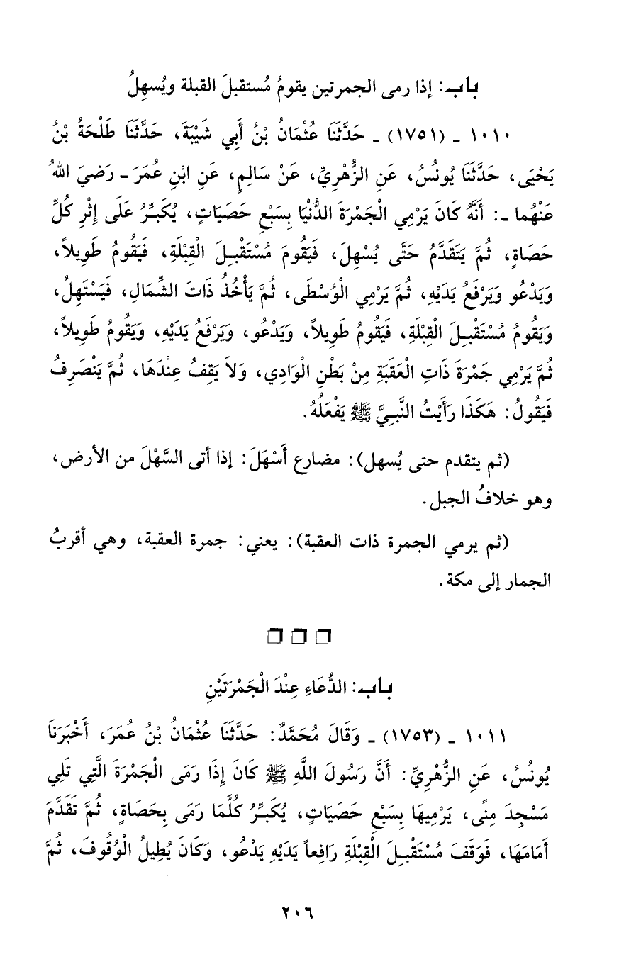 1010 - (1751) - حَدَّثَنَا عُثْمَانُ بْنُ أَبِي شَيْبَةَ، حَدَّثَنَا طَلْحَةُ بْنُ يَحْيَى، حَدَّثَنَا يُونُسُ، عَنِ الزُّهْرِيِّ، عَنْ سَالِمٍ، عَنِ ابْنِ عُمَرَ -رَضيَ اللهُ عَنْهُما -: أَنَّهُ كَانَ يَرْمِي الْجَمْرَةَ الدُّنْيَا بِسَبع حَصَيَاتٍ، يُكَبِّرُ عَلَى إِثْرِ كُلِّ حَصَاةٍ، ثُمَّ يَتَقَدَّمُ حَتَّى يُسْهِلَ، فَيَقُومَ مُسْتَقْبِلَ الْقِبْلَةِ، فَيَقُومُ طَوِيلاً، وَيَدْعُو وَيَرْفعُ يَدَيْهِ، ثُمَّ يَرْمِي الْوُسطَى، ثُمَّ يَأْخُذُ ذَاتَ الشِّمَالِ، فَيَسْتَهِلُ، وَيَقُومُ مُسْتَقْبِلَ الْقِبْلَةِ، فَتقُومُ طَوِيلاً، وَيَدْعُو، وَيرْفَعُ يَدَيْهِ، وَيَقُومُ طَوِيلاً، ثُمَّ يَرْمِي جَمْرَةَ ذَاتِ الْعَقَبَةِ مِنْ بَطْنِ الْوَادِي، وَلاَ يَقِفُ عِنْدَهَا، ثُمَّ يَنْصَرِفُ فَيَقُولُ: هَكَذَا رَأَيْتُ النَّبِيَّ - صلى الله عليه وسلم - يفْعَلُهُ.