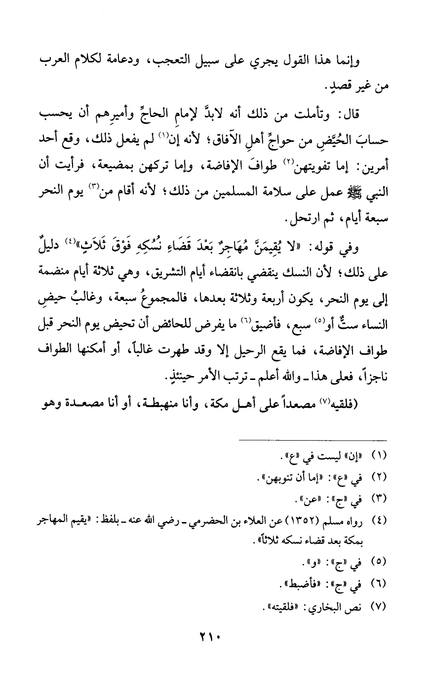 وفي قوله: "لا يُقِيمَنَّ مُهَاجِرٌ بَعْدَ قَضَاءِ نُسُكِهِ فَوْقَ ثَلاَثٍ" (¬4) دليلٌ على ذلك؛ لأن النسك ينقضي بانقضاء أيام التشريق، وهي ثلاثة أيام منضمة إلى يوم النحر، يكون أربعة وثلاثة بعدها، فالمجموعُ سبعة، وغالبُ حيضِ النساء ست أو (¬5) سبع، فأضيق (¬6) ما يفرض للحائض أن تحيض يوم النحر قبل طواف الإفاضة، فما يقع الرحيل إلا وقد طهرت غالباً، أو أمكنها الطواف ناجزاً، فعلى هذا - والله أعلم - ترتب الأمر حينئذٍ.