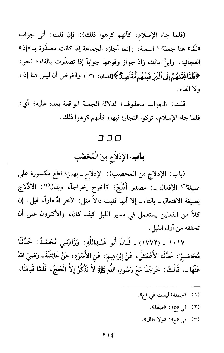 (باب: الإدلاج من المحصب): الإدلاج - بهمزة قطع مكسورة على صيغة (¬2) الإفعال -: مصدر أَدْلَجَ؛ كأخرج إخراجاً، ويقال (¬3): الادِّلاج بصيغة الافتعال - بالتاء - إلا أنها قلبت دالاً مثل: ادَّخر ادّخاراً، قيل: إن كلاً من الفعلين يستعمل في مسير الليل كيف كان، والأكثرون على أن تحققه من أول الليل.