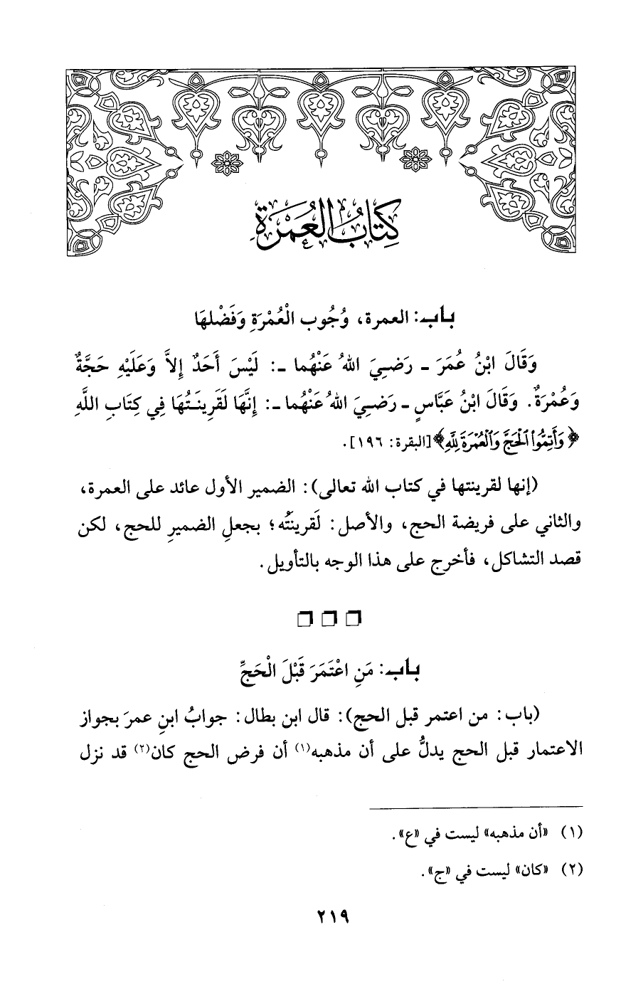وَقَالَ ابْنُ عُمَرَ -رَضِيَ اللهُ عَنْهُما -: لَيْسَ أَحَدٌ إِلاَّ وَعَلَيْهِ حَجَّةٌ وَعُمْرَةٌ. وَقَالَ ابْنُ عَبَّاسٍ -رَضِيَ اللهُ عَنْهُما -: إِنَّهَا لَقَرِينَتُهَا فِي كتَابِ اللهِ {وَأَتِمُّوا الْحَجَّ وَالْعُمْرَةَ لِلَّهِ} [البقرة: 196].