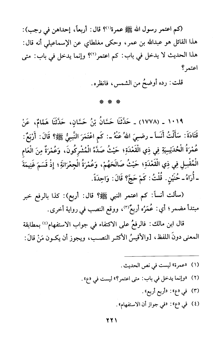 1019 - (1778) - حَدَّثَنَا حَسَّانُ بْنُ حَسَّانٍ، حَدَّثَنَا هَمَّامٌ، عَنْ قَتَادَةَ: سَأَلْتُ أَنسًا -رضِيَ اللهُ عَنْهُ -: كَمِ اعْتَمَرَ النَّبِيُّ - صلى الله عليه وسلم -؟ قَالَ: أَرْبَعٌ: عُمْرَةُ الْحُدَيْبِيَةِ فِي ذِي الْقَعْدَةِ؛ حَيْثُ صَدَّهُ الْمُشْرِكُونَ، وَعُمْرَةٌ مِنَ الْعَامِ الْمُقْبِلِ فِي ذِي الْقَعْدَةِ؛ حَيْثُ صَالَحَهُمْ، وَعُمْرَةُ الْجِعْرَانَةِ؛ إِذْ قَسَمَ غَنِيمَةَ -أُرَاهُ- حُنَيْنٍ. قُلْتُ: كَمْ حَجَّ؟ قَالَ: وَاحِدَةً.