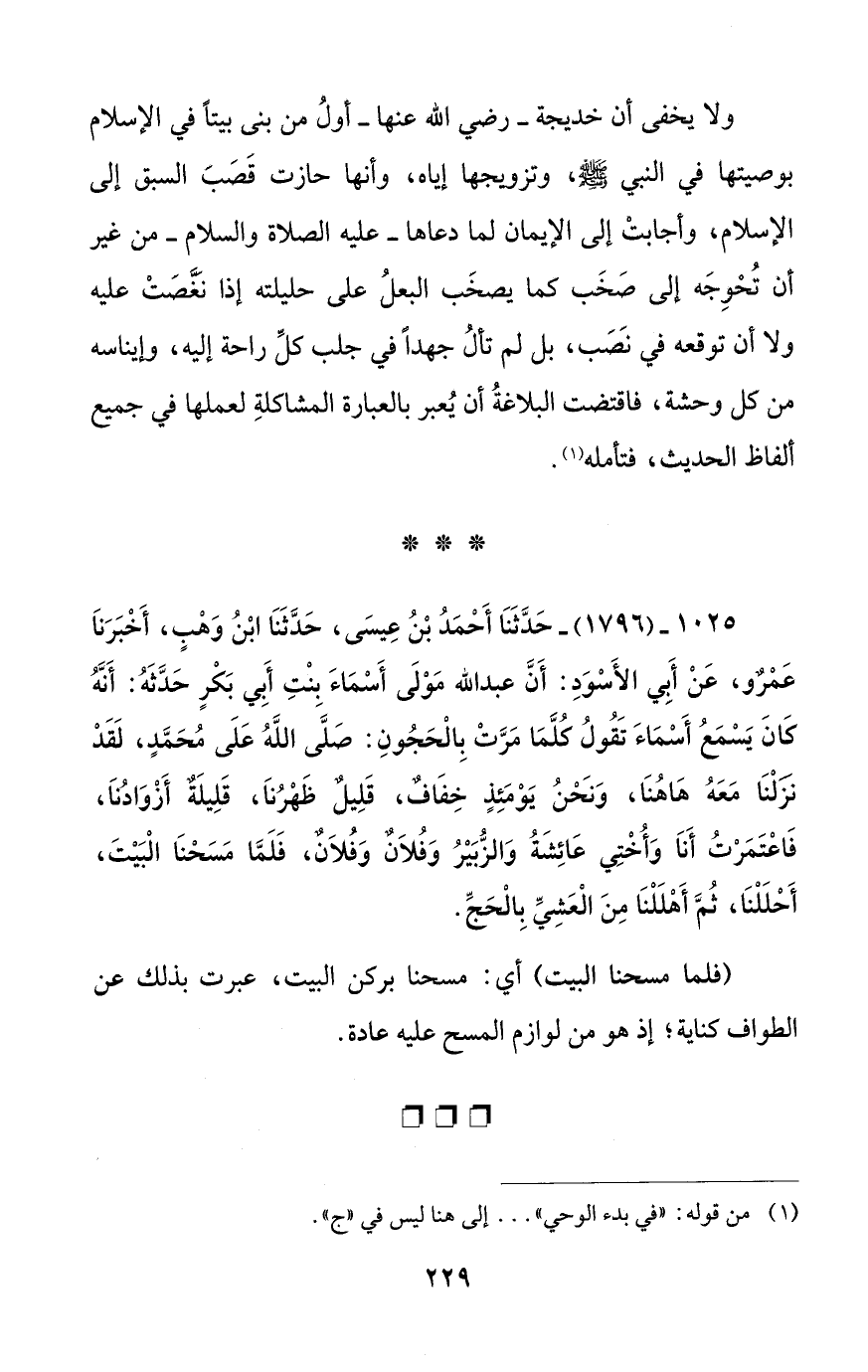 1025 - (1796) - حَدَّثَنَا أَحْمَدُ بْنُ عِيسَى، حَدَّثَنَا ابْنُ وَهْبٍ، أَخْبَرَنَا عَمْرٌو، عَنْ أَبِي الأَسْوَدِ: أَنَّ عبد الله مَوْلَى أَسْمَاءَ بِنْتِ أَبي بَكْرٍ حَدَّثَهُ: أَنَّهُ كَانَ يَسْمَعُ أَسْمَاءَ تَقُولُ كُلَّمَا مَرَّتْ بِالْحَجُونِ: صَلَّى اللهُ عَلَى مُحَمَّدٍ، لَقَدْ نزَلْنَا مَعَهُ هَا هُنَا، وَنَحْنُ يَوْمَئِذٍ خِفَافٌ، قَلِيلٌ ظَهْرُنَا، قَلِيلَةٌ أَزْوَادُنَا، فَاعْتَمَرْتُ أَنَا وَأُخْتِي عَائِشَةُ وَالزُّبَيْرُ وَفُلاَنٌ وَفُلاَنٌ، فَلَمَّا مَسَحْنَا الْبَيْتَ، أَحْلَلْنَا، ثُمَّ أَهْلَلْنَا مِنَ الْعَشِيِّ بِالْحَجِّ.