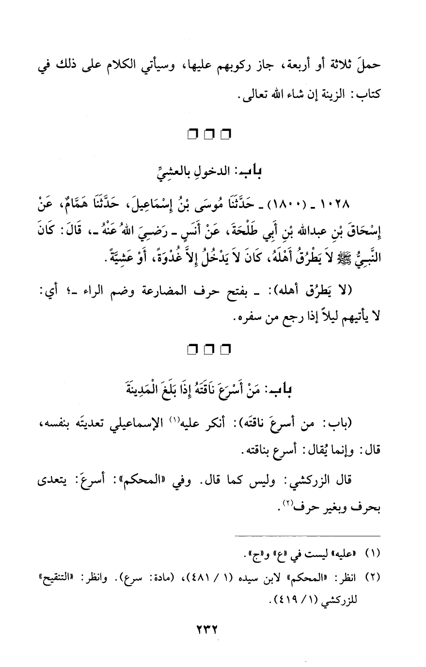 1028 - (1800) - حَدَّثَنَا مُوسَى بْنُ إِسْمَاعِيلَ، حَدَّثَنَا هَمَّامٌ، عَنْ إِسْحَاقَ بْنِ عبد الله بْنِ أَبِي طَلْحَةَ، عَنْ أَنسٍ -رَضِيَ اللهُ عَنْهُ -، قَالَ: كَانَ النَّبِيُّ - صلى الله عليه وسلم - لَا يَطْرُقُ أَهْلَهُ، كَانَ لَا يَدْخُلُ إِلاَّ غُدْوَةً، أَوْ عَشِيَّةً.