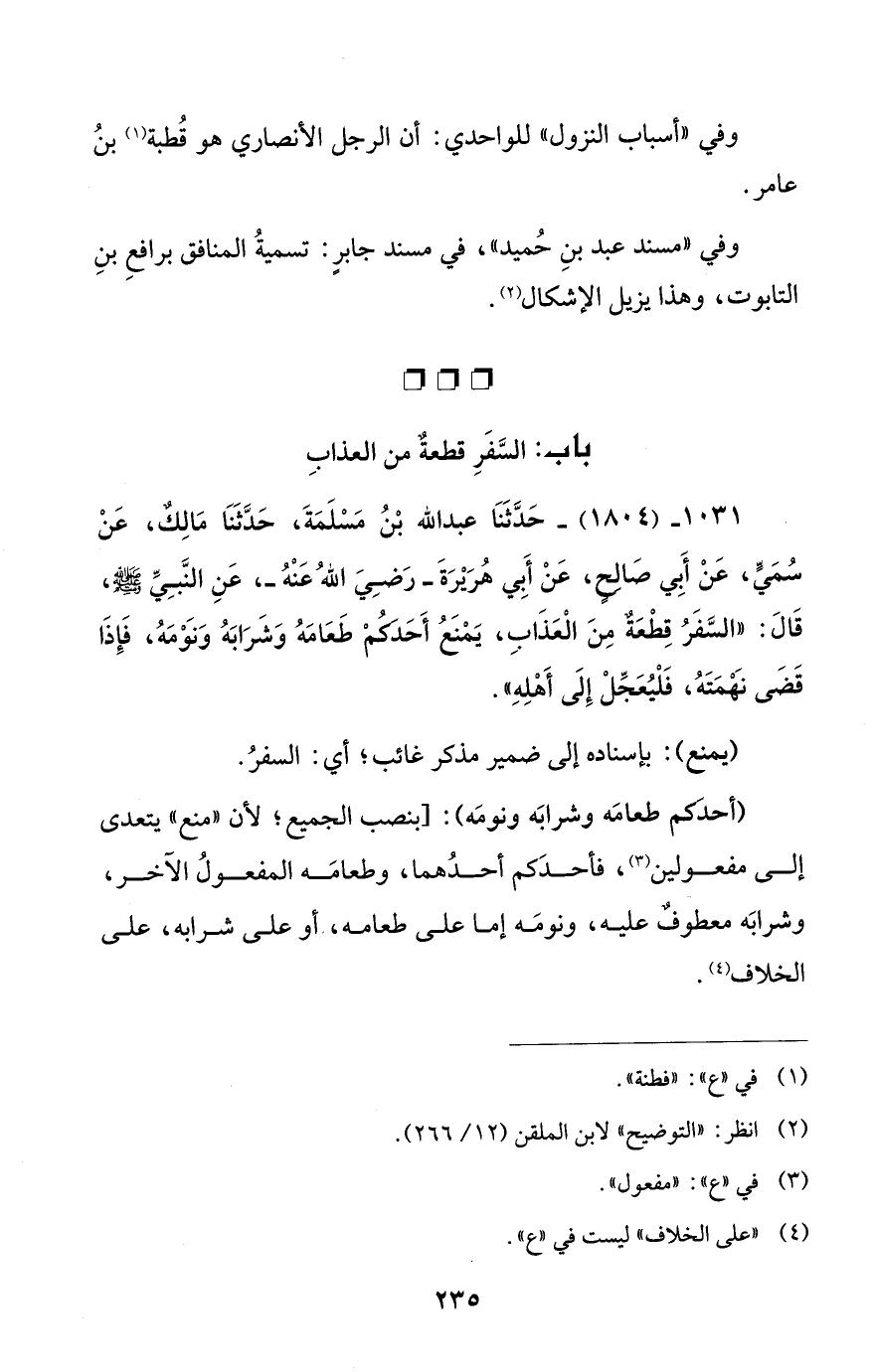 1031 - (1804) - حَدَّثَنَا عبد الله بْنُ مَسْلَمَةَ، حَدَّثَنَا مَالِكٌ، عَنْ سُمَيٍّ، عَنْ أَبِي صَالِحٍ، عَنْ أَبِي هُرَيْرَةَ -رَضِيَ اللهُ عَنْهُ -، عَنِ النَّبِيِّ - صلى الله عليه وسلم -، قَالَ: "السَّفَرُ قِطْعَةٌ مِنَ الْعَذَابِ، يَمْنَعُ أَحَدَكُمْ طَعَامَهُ وَشَرَابَهُ وَنوْمَهُ، فَإِذَا قَضَى نَهْمَتَهُ، فَلْيُعَجِّلْ إِلَى أَهْلِهِ".