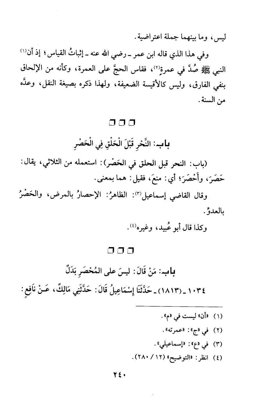 (باب: النحر قبل الحلق في الحَصْر): استعمله من الثلاثي، يقال: حَصَرَ، وأَحْصَرَ؛ أي: منعَ، فقيل: هما بمعنى.
