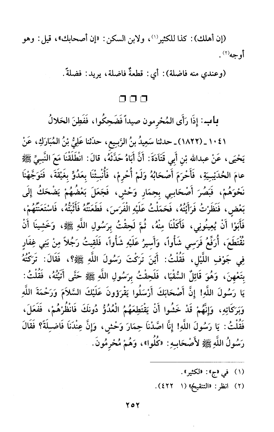 1041 - (1822) - حدثنا سَعِيدُ بنُ الرَّبِيعِ، حدّثنا عَلِيُّ بْنُ المُبَارَكِ، عَنْ يَحْيَى، عَنْ عبد الله بْنِ أَبِي قَتَاَدَةَ: أَنَّ أَبَاهُ حَدَّثَهُ، قالَ: انْطَلَقْنَا مَعَ النَّبِيِّ - صلى الله عليه وسلم - عامَ الحُدَيْبِيَةِ، فَأَحْرَمَ أَصْحَابُهُ وَلَمْ أُحْرِمْ، فَأُنْبِئْنَا بِعَدُوٍّ بِغَيْقَةَ، فتوَجَّهْنَا نَحْوَهُمْ، فَبَصُرَ أَصْحَابِي بِحِمَارِ وَحْشٍ، فَجَعَلَ بَعْضُهُمْ يَضْحَكُ إِلَى بَعْضٍ، فَنَظَرْتُ فَرَأَيْتُهُ، فَحَمَلْتُ عَلَيْهِ الْفَرَسَ، فَطَعَنْتُهُ فَأَثْبَتُّهُ، فَاسْتَعَنْتُهُمْ، فَأَبَوْا أَنْ يُعِينُونَي، فَأَكَلْنَا مِنْهُ، ثُمَّ لَحِقْتُ بِرَسُولِ اللهِ - صلى الله عليه وسلم -، وَخَشِينَا أَنْ نُقْتَطَعَ، أُرَفِّعُ فَرَسِي شَأْواً، وَأَسِيرُ عَلَيْهِ شَأْواً، فَلَقِيتُ رَجُلاً مِنْ بَنِي غِفَارٍ فِي جَوْفِ اللَّيْلِ، فَقُلْتُ: أَيْنَ تَرَكْتَ رَسُولَ اللهِ - صلى الله عليه وسلم -؟، فَقَالَ: تَرَكْتُهُ بِتَعْهِنَ، وَهُوَ قَائِلٌ السُّقْيَا، فَلَحِقْتُ بِرَسُولِ اللهِ - صلى الله عليه وسلم - حَتَّى أَتَيْتُهُ، فَقُلْتُ: يَا رَسُولَ اللهِ! إِنَّ أَصْحَابَكَ أَرْسَلُوا يَقْرَؤونَ عَلَيْكَ السَّلاَمَ وَرَحْمَةَ اللهِ وَبَرَكَاتِهِ، وَإِنَّهُمْ قَدْ خَشُوا أَنْ يَقْتَطِعَهُمُ الْعُدُوُّ دُونَكَ فَانْظُرْهُمْ، فَفَعَلَ، فَقُلْتُ: يَا رَسُولَ اللهِ! إِنَّا اصَّدْنَا حِمَارَ وَحْشٍ، وَإِنَّ عِنْدَنَا فَاضِلَةً؟ فَقَالَ رَسُولُ اللهِ - صلى الله عليه وسلم - لأَصْحَابِهِ: "كُلُوا"، وَهُمْ مُحْرِمُونَ.