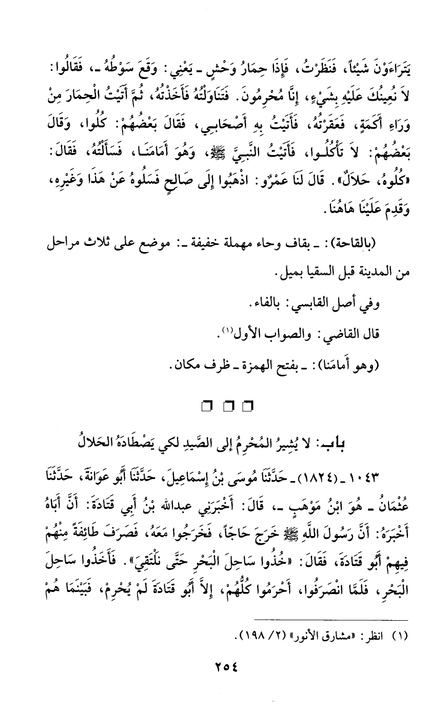 1043 - (1824) - حَدَّثَنَا مُوسَى بْنُ إِسْمَاعِيلَ، حَدَّثَنَا أَبُو عَوَانَةَ، حَدَّثَنَا عُثْمَانُ -هُوَ ابْنُ مَوْهَبٍ-، قَالَ: أَخْبَرَنِي عبد الله بْنُ أَبِي قَتَادَةَ: أَنَّ أَبَاهُ أَخْبَرَهُ: أَنَّ رَسُولَ اللهِ - صلى الله عليه وسلم - خَرَجَ حَاجًّا، فَخَرَجُوا مَعَهُ، فَصَرَفَ طَائِفَةً مِنْهُمْ فِيهِمْ أَبُو قَتَادَةَ، فَقَالَ: "خُذُوا سَاحِلَ الْبَحْرِ حَتَّى نَلْتَقِيَ". فَأَخَذُوا سَاحِلَ الْبَحْرِ، فَلَمَّا انْصَرَفُوا، أَحْرَمُوا كُلُّهُمْ، إِلاَّ أَبُو قَتَادَةَ لَمْ يُحْرِمْ، فَبَيْنَمَا هُمْ