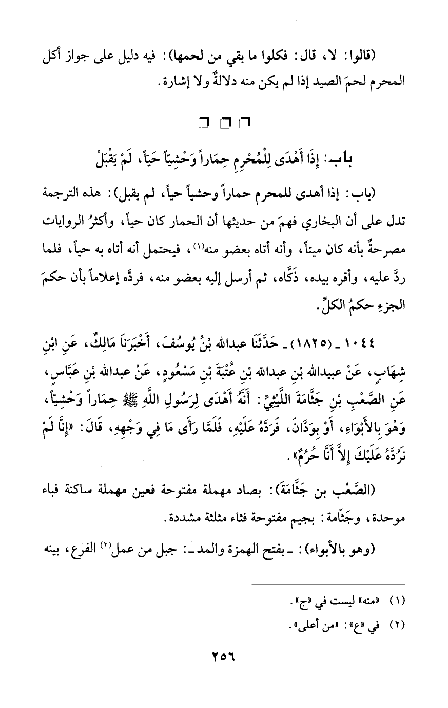 1044 - (1825) - حَدَّثَنَا عبد الله بْنُ يُوسُفَ، أَخْبَرَنَا مَالِكٌ، عَنِ ابْنِ شِهَابٍ، عَنْ عبيد الله بْنِ عبد الله بْنِ عُتْبَةَ بْنِ مَسْعُودٍ، عَنْ عبد الله بْنِ عَبَّاسٍ، عَنِ الصَّعْبِ بْنِ جَثَّامَةَ اللَّيْثِيِّ: أَنَّهُ أَهْدَى لِرَسُولِ اللهِ - صلى الله عليه وسلم - حِمَاراً وَحْشِيًّا، وَهْوَ بِالأَبْوَاءِ، أَوْ بِوَدَّانَ، فَرَدَّهُ عَلَيْهِ، فَلَمَّا رَأَى مَا فِي وَجْهِهِ، قَالَ: "إِنَّا لَمْ نَرُدَّهُ عَلَيْكَ إِلاَّ أَنَّا حُرُمٌ".